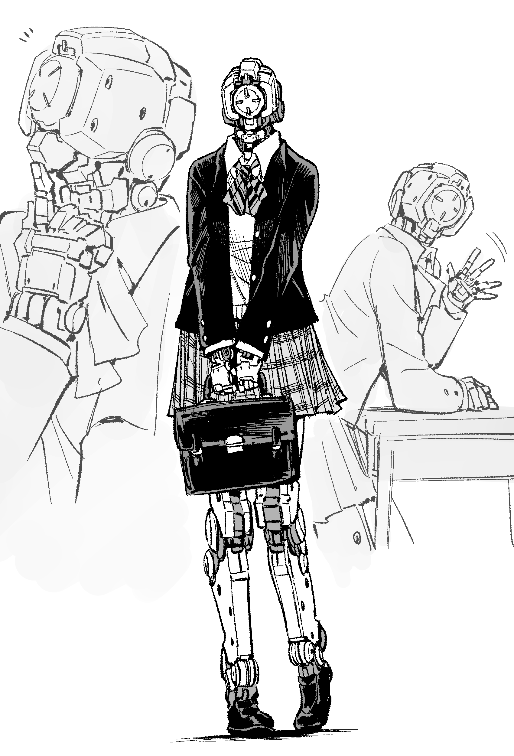 absurdres bag blazer bow bowtie desk diagonal-striped_bow diagonal-striped_bowtie diagonal-striped_clothes full_body greyscale highres humanoid_robot jacket kato_takuji loafers long_sleeves looking_at_viewer mechanical_hands mechanical_legs miniskirt monochrome multiple_views original plaid_clothes plaid_skirt pleated_skirt robot school_bag school_desk school_uniform shoes skirt solo striped_bow striped_bowtie striped_clothes waving white_background