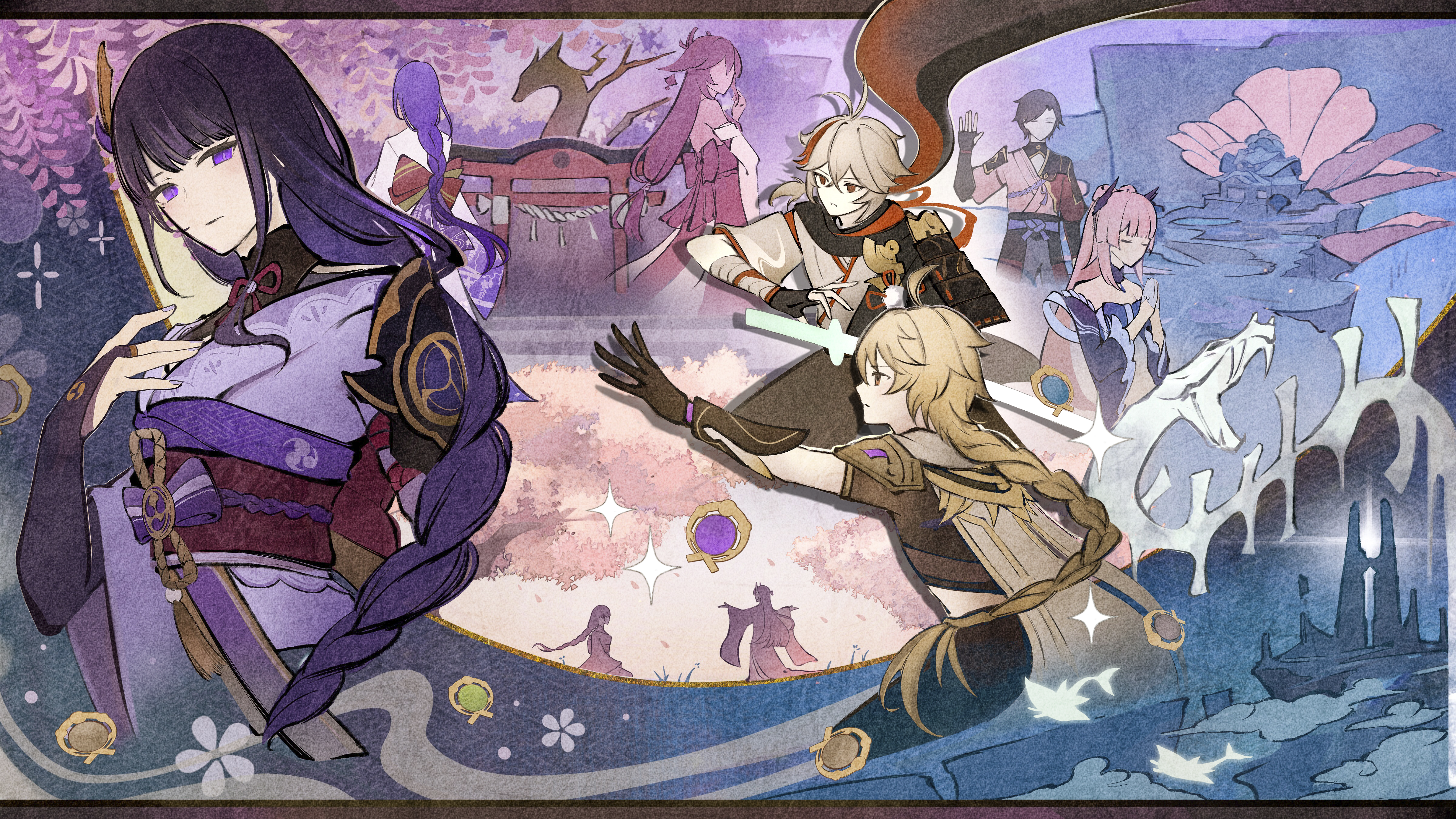 3boys 4girls absurdres aether_(genshin_impact) anna_(drw01) antenna_hair black_gloves blonde_hair braid braided_ponytail commentary_request faceless faceless_female genshin_impact gloves hair_between_eyes hand_on_own_chest hand_up highres hoyofair japanese_clothes kaedehara_kazuha kimono long_hair looking_at_viewer low-tied_long_hair makoto_(genshin_impact) multicolored_hair multiple_boys multiple_girls obi obiage obijime official_art own_hands_together pink_hair purple_eyes purple_hair purple_kimono raiden_shogun reaching sangonomiya_kokomi sash streaked_hair sword teppei_(genshin_impact) torii tree very_long_hair vision_(genshin_impact) weapon white_hair yae_miko yellow_eyes