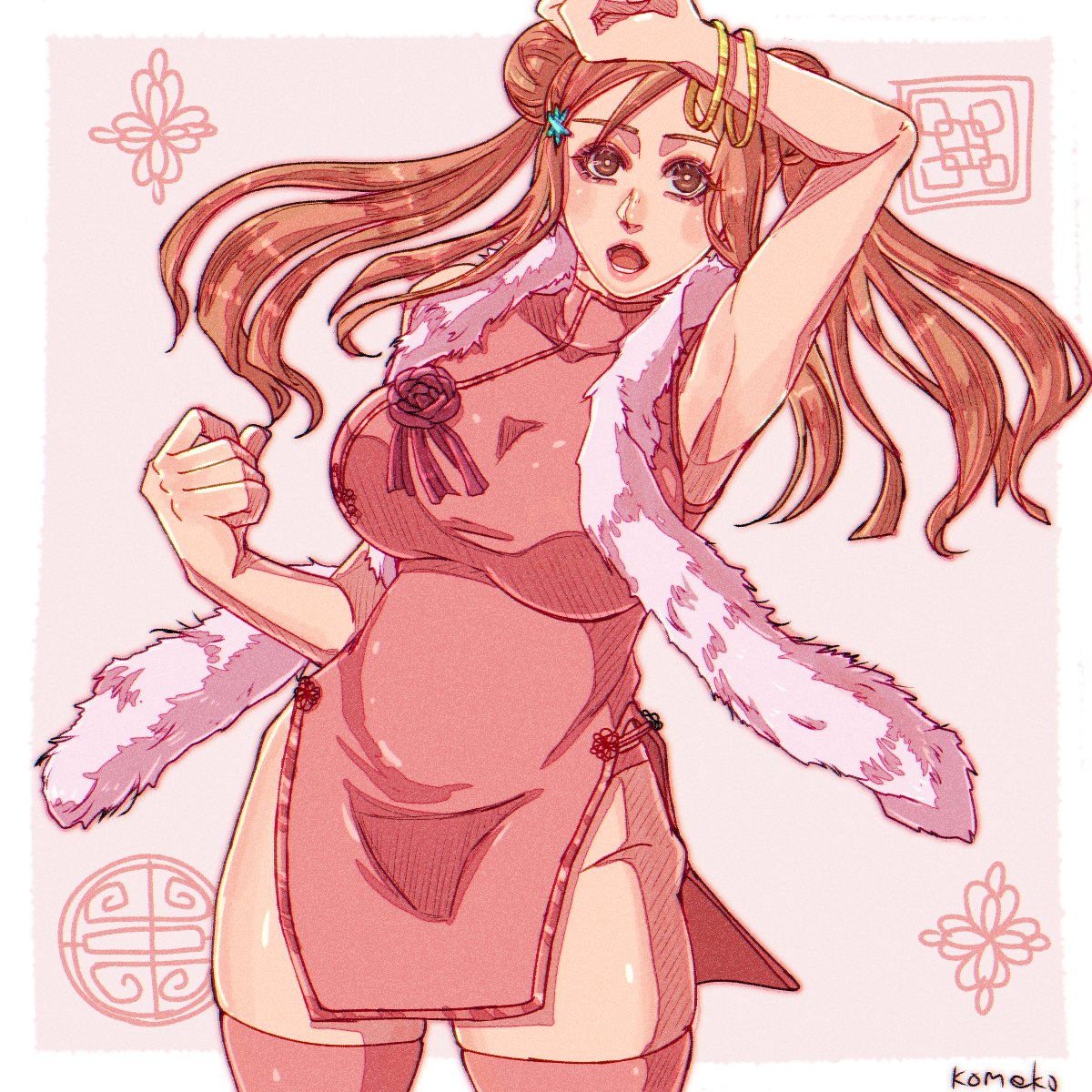 1girl arm_above_head armpits artist_name bangle bleach bleach:_brave_souls border bracelet breasts brown_eyes brown_hair china_dress chinese_clothes clenched_hands double_bun dress dress_flower flower fur_scarf gold_bracelet grey_background hair_bun hair_ornament highres inoue_orihime jewelry komeko_(strikek-lvvjm27) large_breasts official_alternate_costume open_mouth pelvic_curtain pink_dress pink_thighhighs red_flower sidelocks skindentation sleeveless sleeveless_dress snowflake_hair_ornament solo thighhighs thighs twintails white_border