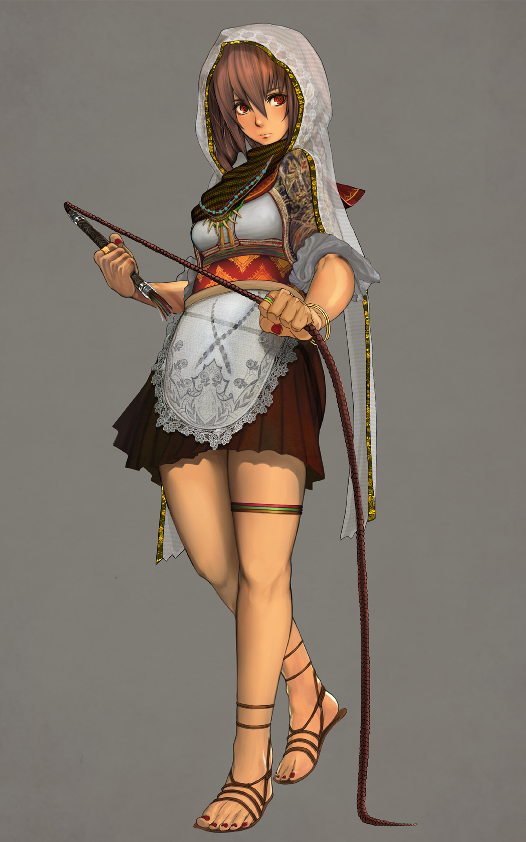 1girl apron bracelet breasts brown_hair brown_sandals closed_mouth commentary_request full_body gold_bracelet grey_background hair_between_eyes highres holding holding_whip jewelry lace-trimmed_apron lace_trim medium_breasts medium_hair multiple_necklaces nail_polish necklace niiyaso original pleated_skirt red_eyes red_nails red_skirt sandals shirt shrug_(clothing) simple_background skirt solo standing thighlet three-quarter_sleeves toenail_polish toenails tooth_necklace veil whip white_shirt white_veil