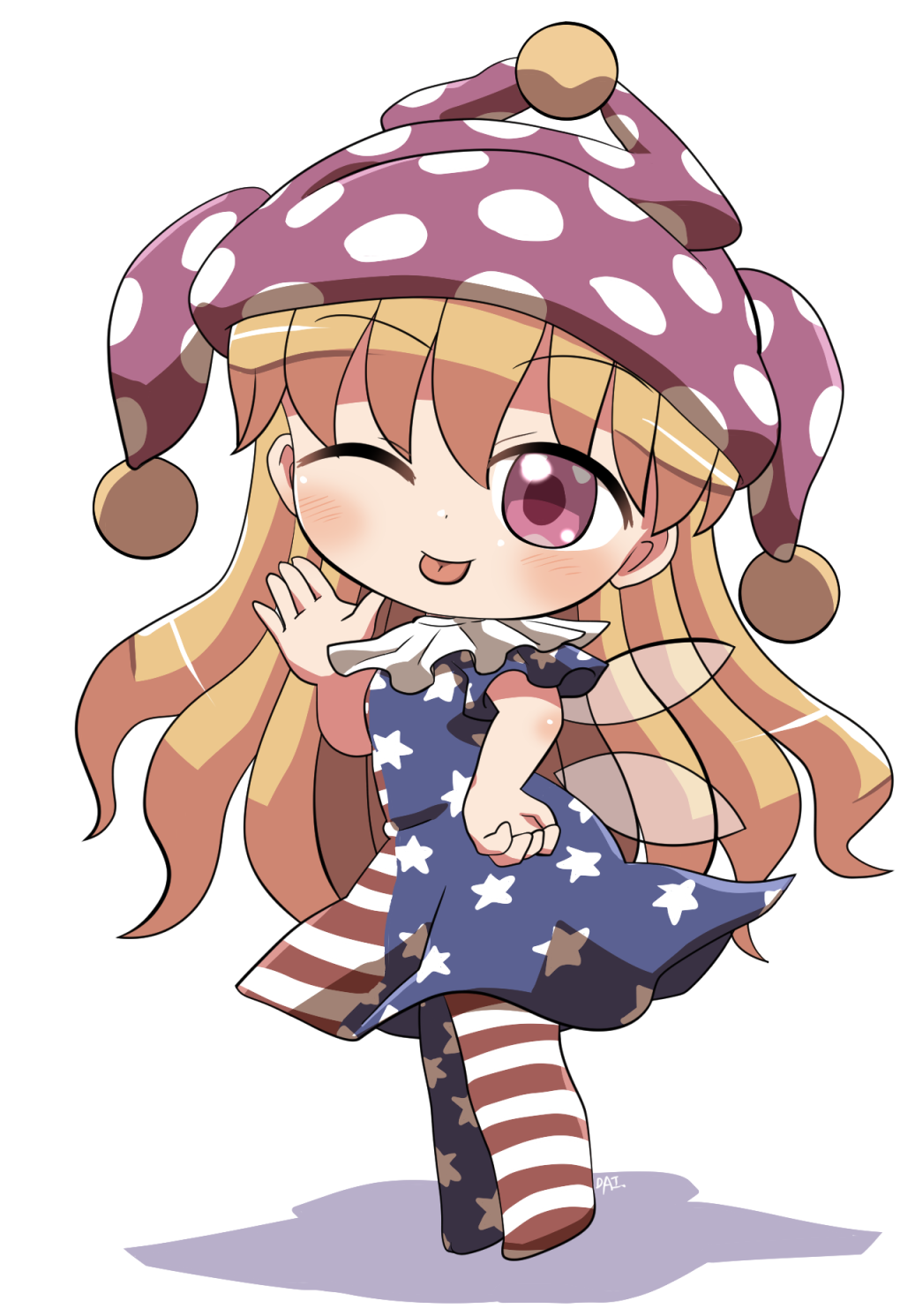 &{ID:12708271 CreatedAt:Sun Sep 28 00:30:52 -0500 2025 Score:1 Width:1037 Height:1491 MD5:8edeeefabfc597d78f096b2c6a4b0c23 Directory:8e/de Image:8edeeefabfc597d78f096b2c6a4b0c23.png Rating:general Source:https://www.pixiv.net/artworks/135630231 Change:1759037452 Owner:danbooru CreatorID:6498 ParentID:0 Sample:0 PreviewHeight:350 PreviewWidth:243 Tags:1girl american_flag american_flag_print blonde_hair blush chibi chibi_only closed_mouth clownpiece commentary_request dress fairy_wings flag_print full_body hand_up hat highres jester_cap long_hair looking_at_viewer neck_ruff no_shoes one_eye_closed pantyhose pink_eyes pink_hat polka_dot_headwear print_dress print_pantyhose rokugou_daisuke short_sleeves signature simple_background smile solo standing star_(symbol) star_print striped_clothes striped_dress striped_pantyhose touhou very_long_hair white_background wings Title: HasNotes:false HasComments:false FileURL:https://img2.gelbooru.com/images/8e/de/8edeeefabfc597d78f096b2c6a4b0c23.png PreviewURL:https://gelbooru.com/thumbnails/8e/de/thumbnail_8edeeefabfc597d78f096b2c6a4b0c23.jpg SampleURL: SampleHeight:0 SampleWidth:0 Status:active PostLocked:0 HasChildren:false IsVideo:false DisplayDate:28.09.2025 00:30}