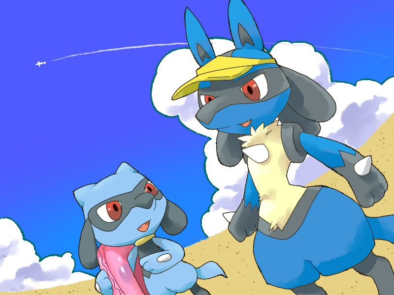 commentary_request contrail day gen_4_pokemon holding holding_swim_ring innertube isumimax looking_at_another looking_to_the_side lucario nintendo no_humans open_mouth outdoors pokemon pokemon_(creature) red_eyes riolu sand sky smile swim_ring visor_cap