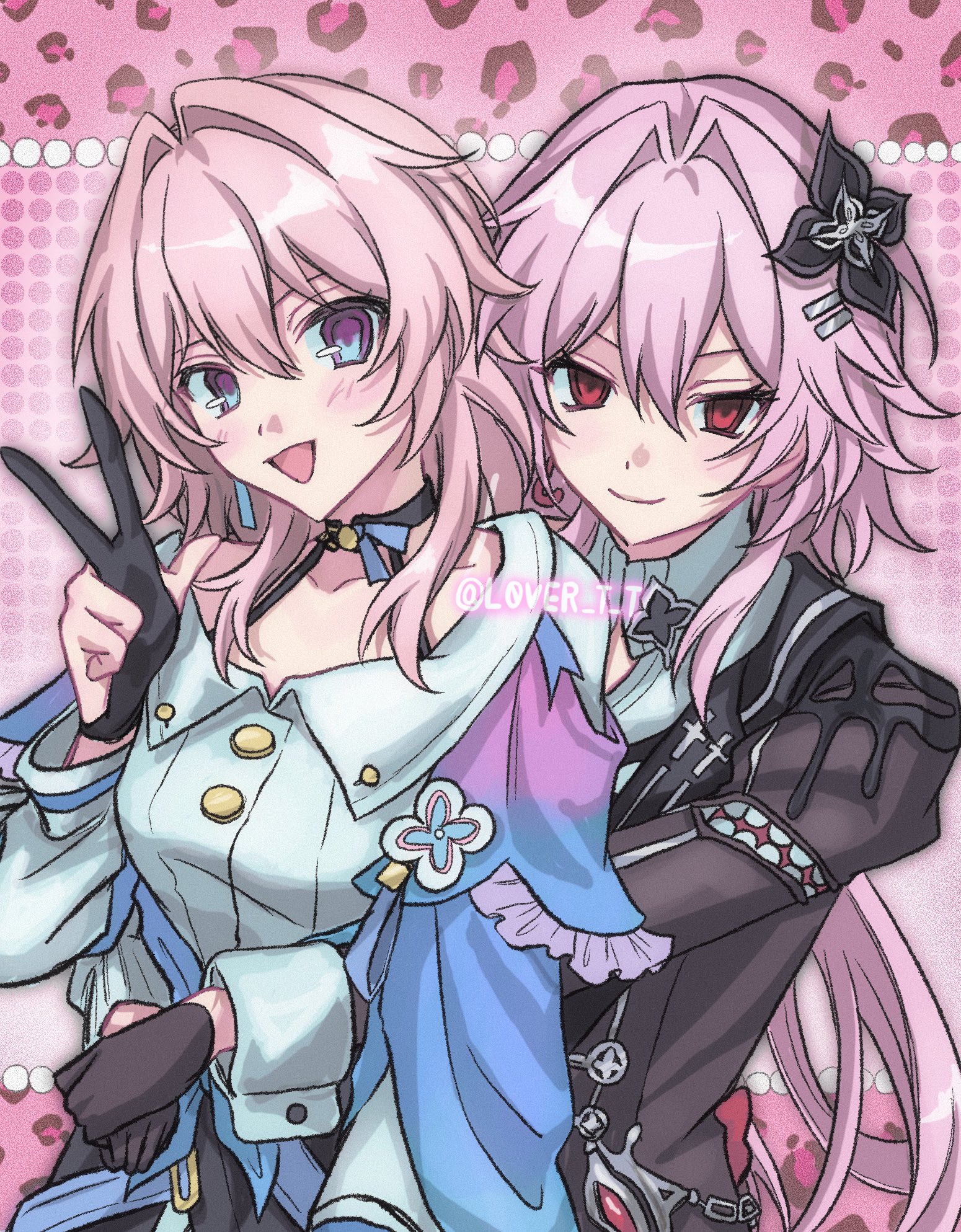 2girls :d black_choker black_dress black_flower black_gloves blue_eyes blush buttons choker dress dual_persona evernight_(honkai:_star_rail) flower gem gloves hair_between_eyes hair_flower hair_ornament hairclip highres honkai:_star_rail honkai_(series) hug jacket l0ver_t_t march_7th_(honkai:_star_rail) march_7th_(preservation)_(honkai:_star_rail) multicolored_eyes multicolored_jacket multiple_girls off-shoulder_jacket off_shoulder open_mouth parallel_hairclips partially_fingerless_gloves pink_background pink_eyes pink_hair red_eyes red_gem shirt smile twitter_username two-tone_eyes two-tone_jacket v white_shirt