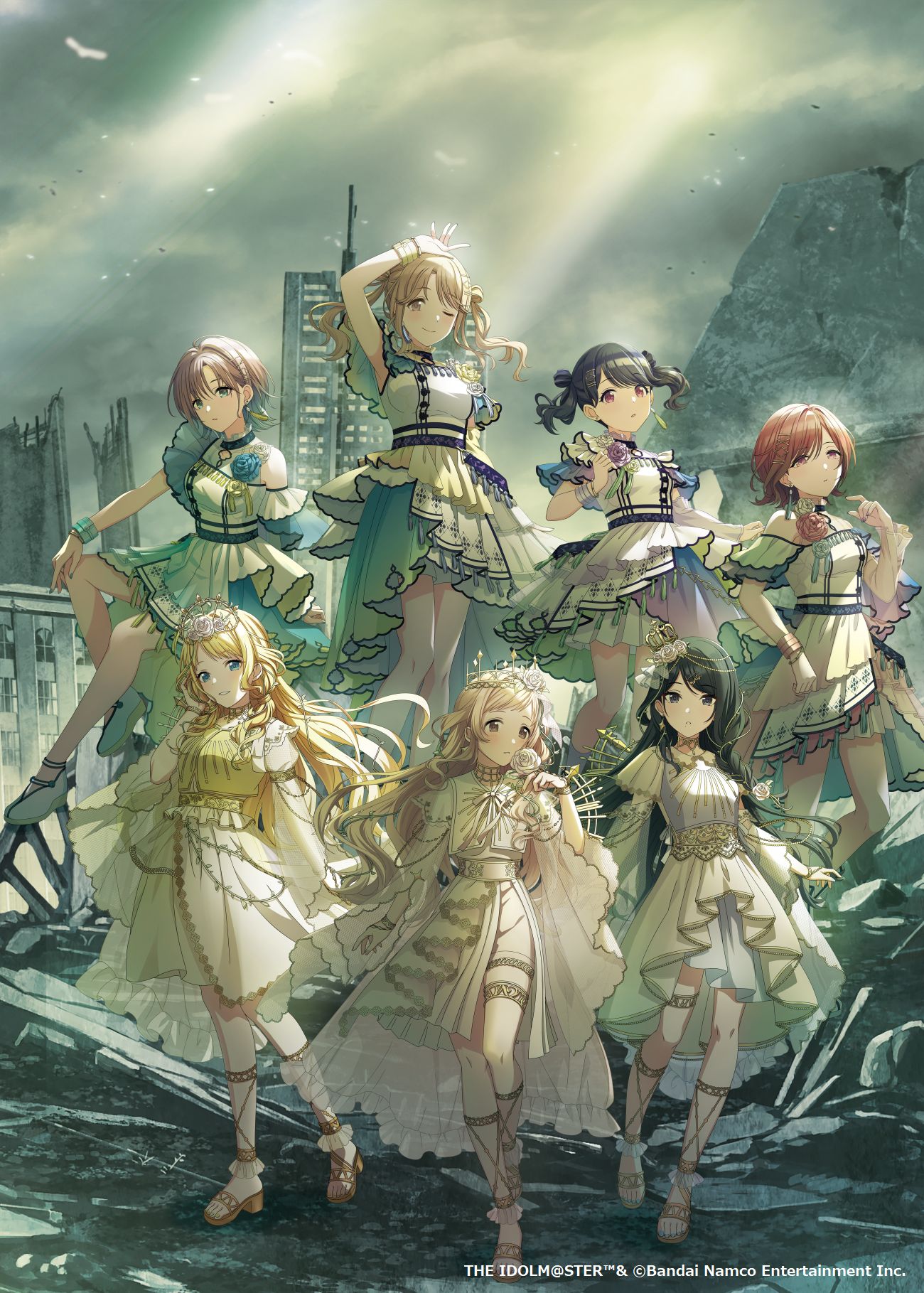 6+girls asakura_toru bare_shoulders bird black_hair blue_eyes crown dress earrings fukumaru_koito hachimiya_meguru highres higuchi_madoka ichikawa_hinana idol_clothes idolmaster idolmaster_shiny_colors illumination_stars_(idolmaster) jewelry kazano_hiori multicolored_hair multiple_girls noctchill_(idolmaster) official_art open_mouth ruins sakuragi_mano sandals short_hair sitting smile standing toes twintails white_bird