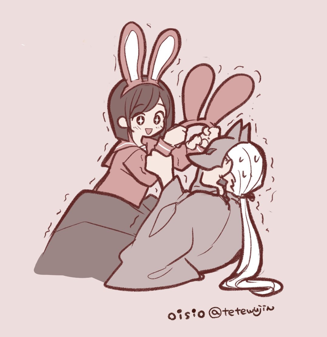 1boy 1girl animal_ear_hairband animal_ears artist_name blush brown_hair earrings fake_animal_ears fox_mask hairband holding_another's_wrists holding_hairband japanese_clothes jewelry long_hair low_ponytail mask oisiso open_mouth pink_sailor_collar pink_serafuku pink_shirt ponytail rabbit_ears sailor_collar school_uniform serafuku shimizu_hinako shimizu_hinako_(pink_rabbit_costume) shirt short_hair silent_hill_(series) silent_hill_f single_earring smile sparkling_eyes sweatdrop twitter_username white_hair