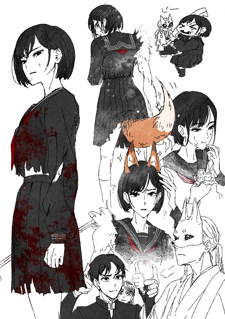 2boys 2girls ? animal_ears black_hair black_jacket black_sailor_collar black_sclera black_serafuku black_shirt black_skirt blood blood_on_clothes bridal_gauntlets candy chibi chibi_inset chocolate chocolate_bar colored_sclera cow dirty dirty_face earrings eating food fox_ears fox_girl fox_mask fox_mask_(silent_hill) fox_tail gakuran hitsuji_kusa holding holding_chocolate holding_food holding_lead_pipe iwai_shu jacket japanese_clothes jewelry kemonomimi_mode lead_pipe mask midriff_peek multiple_boys multiple_girls necktie nishida_rinko parted_bangs parted_lips pleated_skirt ponytail red_necktie robe sailor_collar school_uniform serafuku shimizu_hinako shirt short_hair silent_hill_(series) silent_hill_f single_earring skirt spoilers tail tassel tassel_earrings thumbs_up torn_clothes torn_shirt torn_skirt transformation white_background white_robe