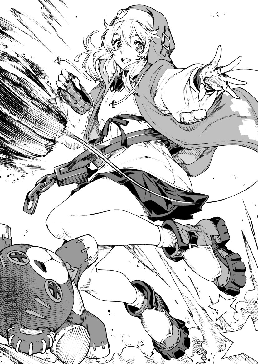 1boy androgyne_symbol androgynous bridget_(guilty_gear) chain fingerless_gloves gloves greyscale guilty_gear guilty_gear_strive jumping long_hair long_sleeves looking_at_viewer male_focus monochrome nun open_mouth puffy_long_sleeves puffy_sleeves saeki_shun smile solo stuffed_animal stuffed_toy teddy_bear teeth trap upper_teeth_only yo-yo