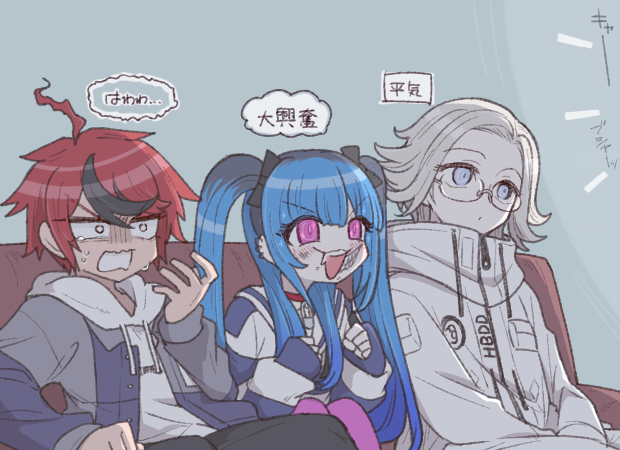 1girl 2boys ahoge amemiya_darumi aotsuki_eito black_bow black_hair black_pants black_streaks blue_hair blue_jacket bow bright_pupils chiyo408 choker closed_mouth commentary couch dot_mouth drooling ear_piercing excited expressionless facial_mark glasses grey_eyes grey_hair grey_jacket grin hair_bow heart heart_facial_mark hood hoodie jacket jacket_over_hoodie long_hair looking_ahead makeup multicolored_hair multicolored_jacket multiple_boys nervous_sweating on_couch open_mouth pants piercing red_choker red_hair roots_(hair) scared shirt short_hair sitting smile streaked_hair striped_clothes striped_shirt sumino_takumi sweat tearing_up the_hundred_line_-last_defense_academy- translated twintails two-tone_jacket watching_television white_hoodie white_jacket white_pants white_pupils wide-eyed