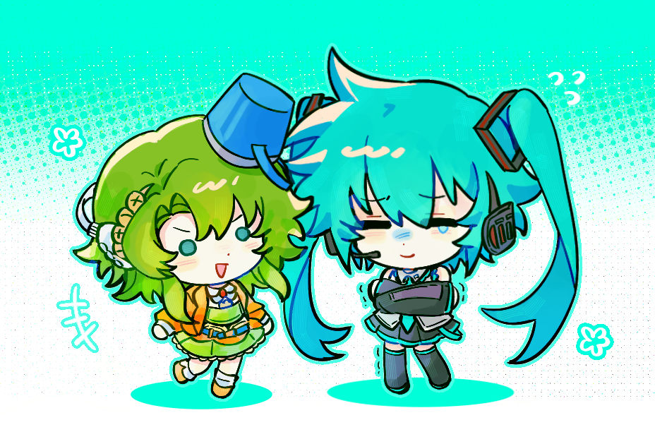 +++ 1boy 1girl :d ^_^ absurdly_long_hair ankle_socks aqua_eyes aqua_flower aqua_hair aqua_necktie aqua_outline aqua_trim bare_shoulders black_boots black_skirt black_sleeves boots bucket bucket_hat chibi chibi_only chinese_commentary closed_eyes closed_mouth collared_shirt commentary_request cosplay crossed_arms detached_collar detached_sleeves dot_nose double-parted_bangs dress flower flying_sweatdrops frilled_shirt frilled_shirt_collar frills full_body genderswap genderswap_(mtf) gongs0313 gradient_background green_background green_dress green_hair grey_shirt gumi gumi_(ai_megpoid) gumi_(cosplay) hair_between_eyes hair_ornament hat hatsune_miku hatsune_miku_(cosplay) headphones hiyori_sou jacket kimi_ga_shine kizuchi_kanna long_hair long_sleeves looking_at_another medium_hair miniskirt necktie open_clothes open_jacket open_mouth orange_jacket orange_shoes outline pale_skin petticoat pleated_skirt shirt shoes simple_background skirt sleeveless sleeveless_shirt smile socks solid_circle_eyes standing standing_on_one_leg tearing_up thigh_boots thighhighs trembling turn_pale twintails two-tone_background v-shaped_eyebrows very_long_hair vocaloid white_background white_socks zettai_ryouiki