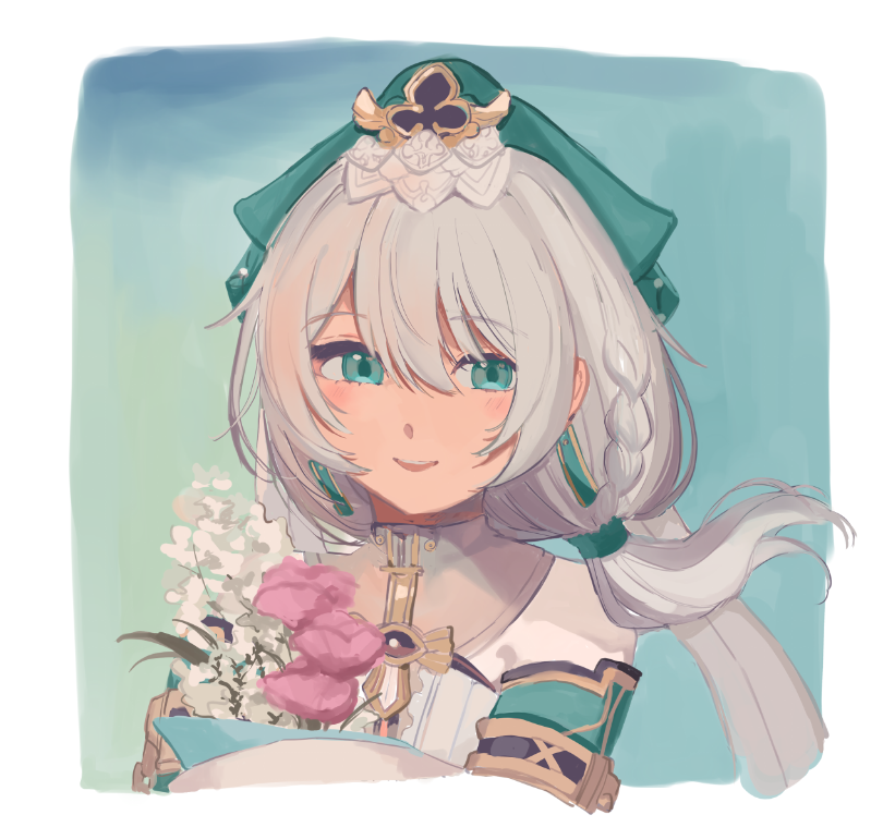 1girl 8sayo7_(8sayo7honkai) aqua_eyes bouquet braid commentary_request floating_hair flower flower_request green_hat hat holding holding_bouquet honkai_(series) honkai_impact_3rd long_hair pink_flower ponytail smile solo theresa_apocalypse theresa_apocalypse_(astralop) white_flower white_hair