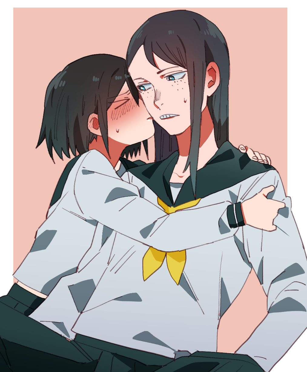 2girls asakusa_midori black_hair blush commentary eizouken_ni_wa_te_wo_dasu_na! freckles highres kanamori_sayaka long_hair multiple_girls neckerchief school_uniform serafuku short_hair takao_(88499191) teeth yellow_neckerchief yuri