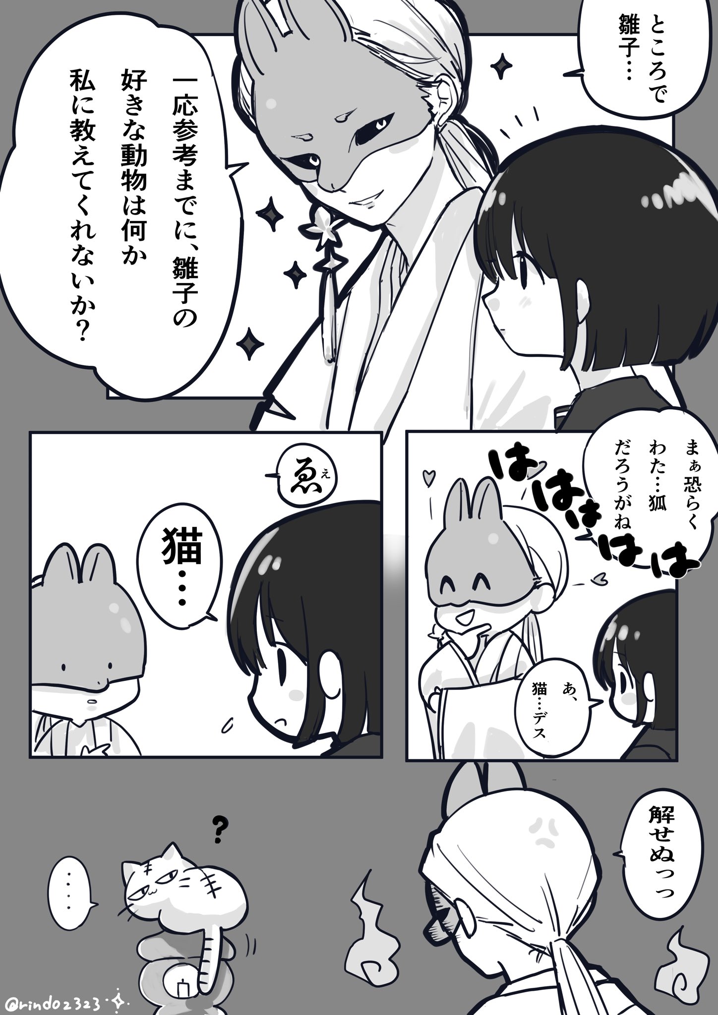 ... 1boy 1girl ? black_hair black_sclera border cat colored_sclera earrings flower fox_mask fox_mask_(silent_hill) grey_border greyscale hand_on_own_chin highres hoshirindo japanese_clothes jewelry long_hair low_ponytail mask monochrome parted_lips ponytail rose school_uniform shimizu_hinako short_hair silent_hill_(series) silent_hill_f single_earring slit_pupils smile spoken_ellipsis tassel tassel_earrings translation_request twitter_username white_flower white_hair white_rose wide_sleeves