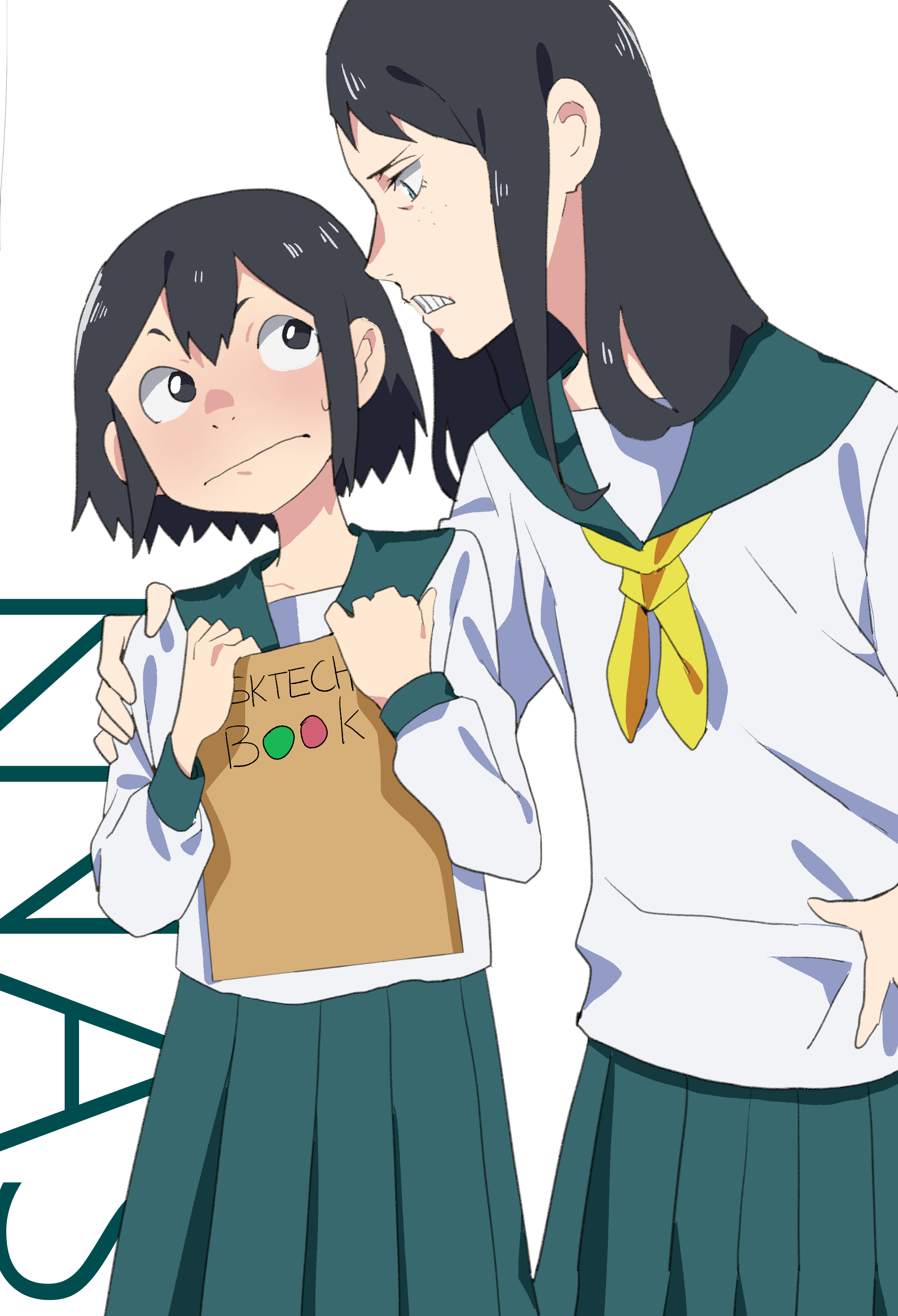 2girls absurdres asakusa_midori black_hair blush commentary eizouken_ni_wa_te_wo_dasu_na! freckles hand_on_another's_shoulder highres kanamori_sayaka long_hair multiple_girls neckerchief school_uniform serafuku short_hair simple_background sketchbook takao_(88499191) teeth white_background yellow_neckerchief