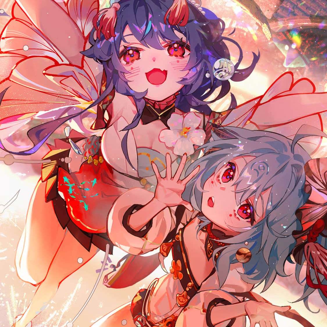 2girls artist_request bili_girl_22 bili_girl_33 bilibili blue_hair chinese_clothes cropped fang fireworks multiple_girls red_eyes second-party_source