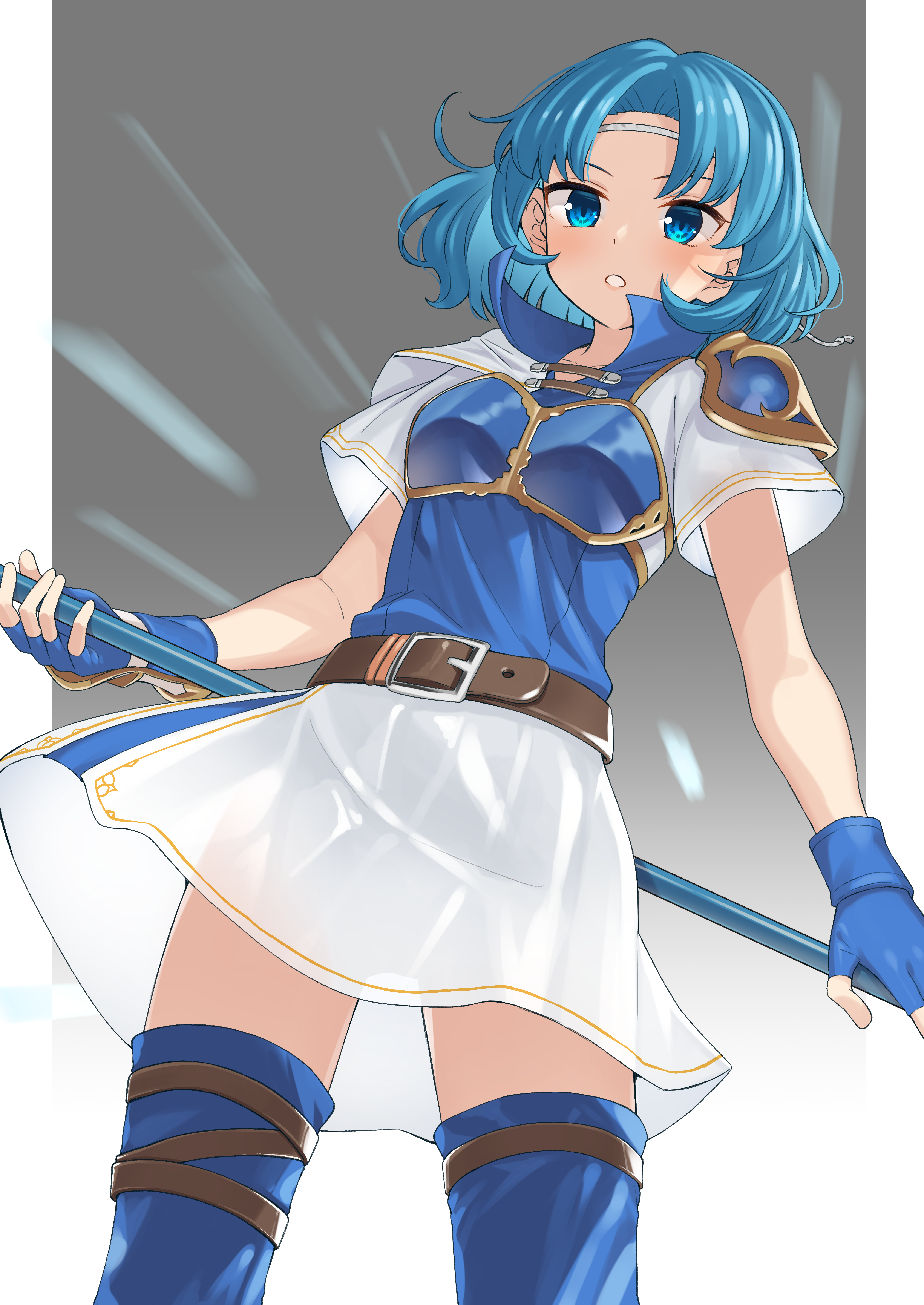 1girl absurdres armor bare_arms blue_armor blue_eyes blue_gloves blue_hair boots breastplate circlet commission commissioner_upload couzone cowboy_shot fingerless_gloves fire_emblem fire_emblem:_the_binding_blade gloves grey_headband headband highres holding holding_polearm holding_weapon nintendo non-web_source pixiv_commission polearm short_hair short_sleeves simple_background skirt solo spear thea_(fire_emblem) thigh_boots thighhighs thighs weapon white_skirt zettai_ryouiki