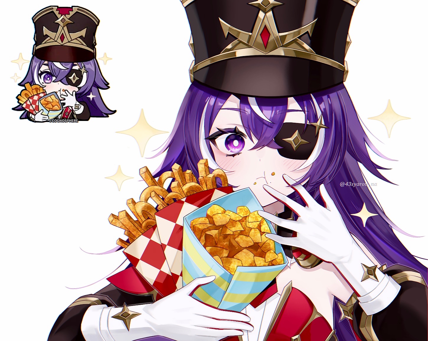 &{ID:12715148 CreatedAt:Mon Sep 29 06:45:13 -0500 2025 Score:3 Width:1450 Height:1156 MD5:6b8b8bf2aaa150b7ecf57e2927773433 Directory:6b/8b Image:6b8b8bf2aaa150b7ecf57e2927773433.jpg Rating:general Source:https://twitter.com/43syarou_na/status/1909539215387640289 Change:1771923439 Owner:danbooru CreatorID:6498 ParentID:0 Sample:1 PreviewHeight:279 PreviewWidth:350 Tags:1girl :t black_hat blush bright_pupils chevreuse_(genshin_impact) closed_mouth commentary_request crumbs eating eyepatch food food_on_face french_fries genshin_impact hoyolab_sticker_redraw gloves hat holding holding_food long_hair looking_at_viewer multicolored_hair purple_eyes purple_hair shako_cap star_(symbol) streaked_hair syarou twitter_username two-tone_hair white_background white_gloves white_hair white_pupils Title: HasNotes:false HasComments:false FileURL:https://img2.gelbooru.com/images/6b/8b/6b8b8bf2aaa150b7ecf57e2927773433.jpg PreviewURL:https://gelbooru.com/thumbnails/6b/8b/thumbnail_6b8b8bf2aaa150b7ecf57e2927773433.jpg SampleURL:https://img2.gelbooru.com/samples/6b/8b/sample_6b8b8bf2aaa150b7ecf57e2927773433.jpg SampleHeight:678 SampleWidth:850 Status:active PostLocked:0 HasChildren:false IsVideo:false DisplayDate:29.09.2025 06:45}