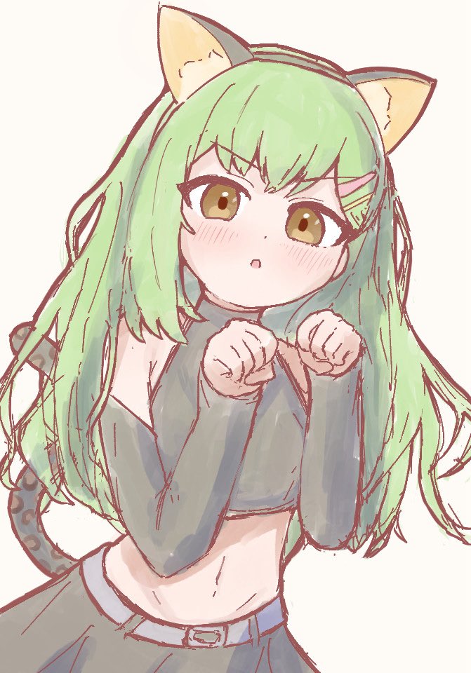 1girl :o alternate_costume animal_ear_hairband animal_ears bare_shoulders black_skirt blush brown_eyes cat_ear_hairband cat_ears commentary_request crop_top detached_sleeves fake_animal_ears fake_tail green_hair hair_ornament hairband hairclip international_cat_day leopard_tail link!_like!_love_live! long_hair looking_at_viewer love_live! midriff navel ogami_sachi parallel_hairclips paw_pose pleated_skirt skirt solo tail tokusa_(sachi_biglove) v-shaped_eyebrows