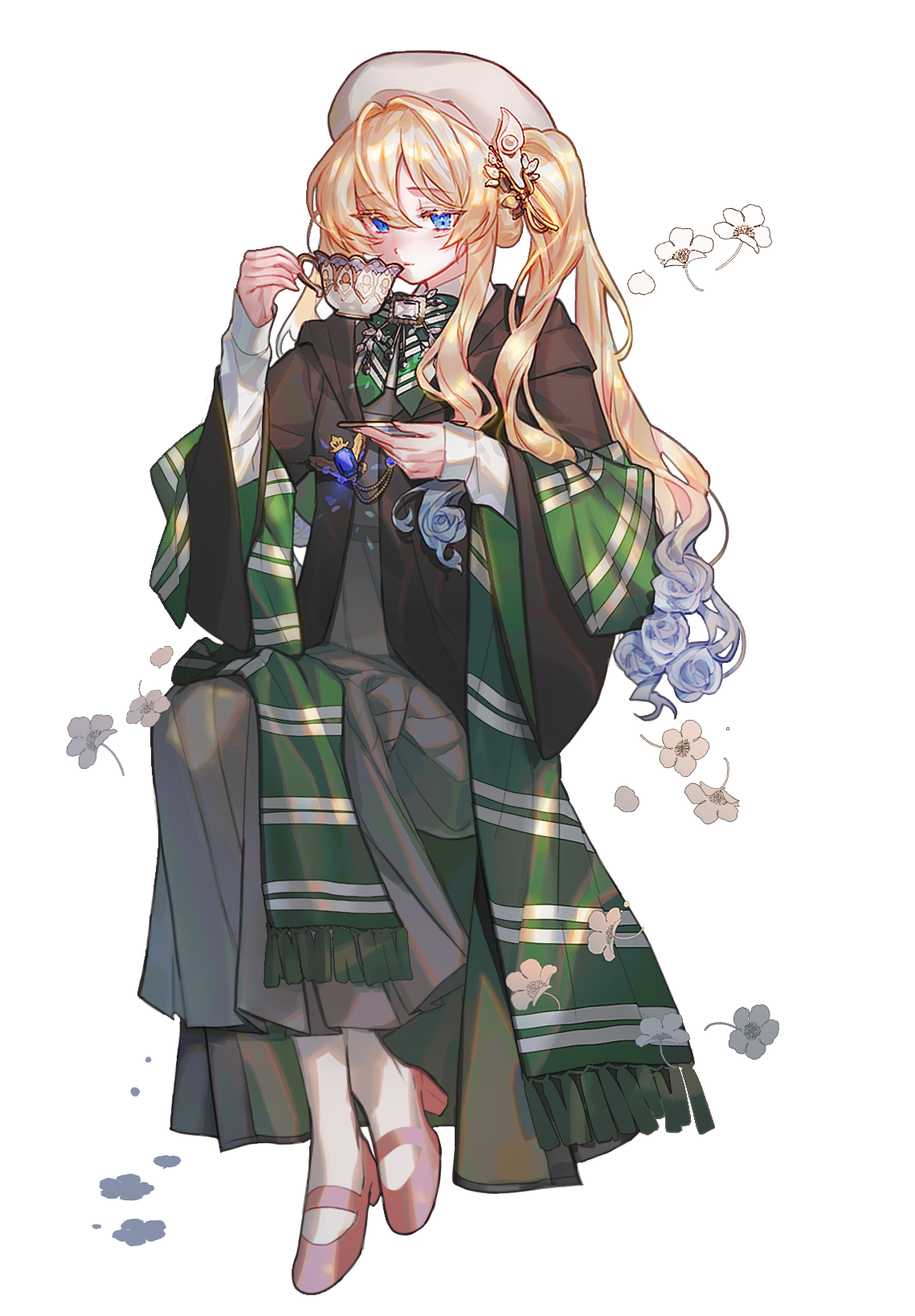 1girl bamcream blonde_hair blue_eyes brown_jacket closed_mouth commentary commission cup dress english_commentary full_body green_scarf grey_dress hat high_heels highres holding holding_cup holding_saucer jacket long_hair long_sleeves open_clothes open_jacket original pink_shoes saucer scarf shoes socks solo teacup transparent_background white_hat white_socks