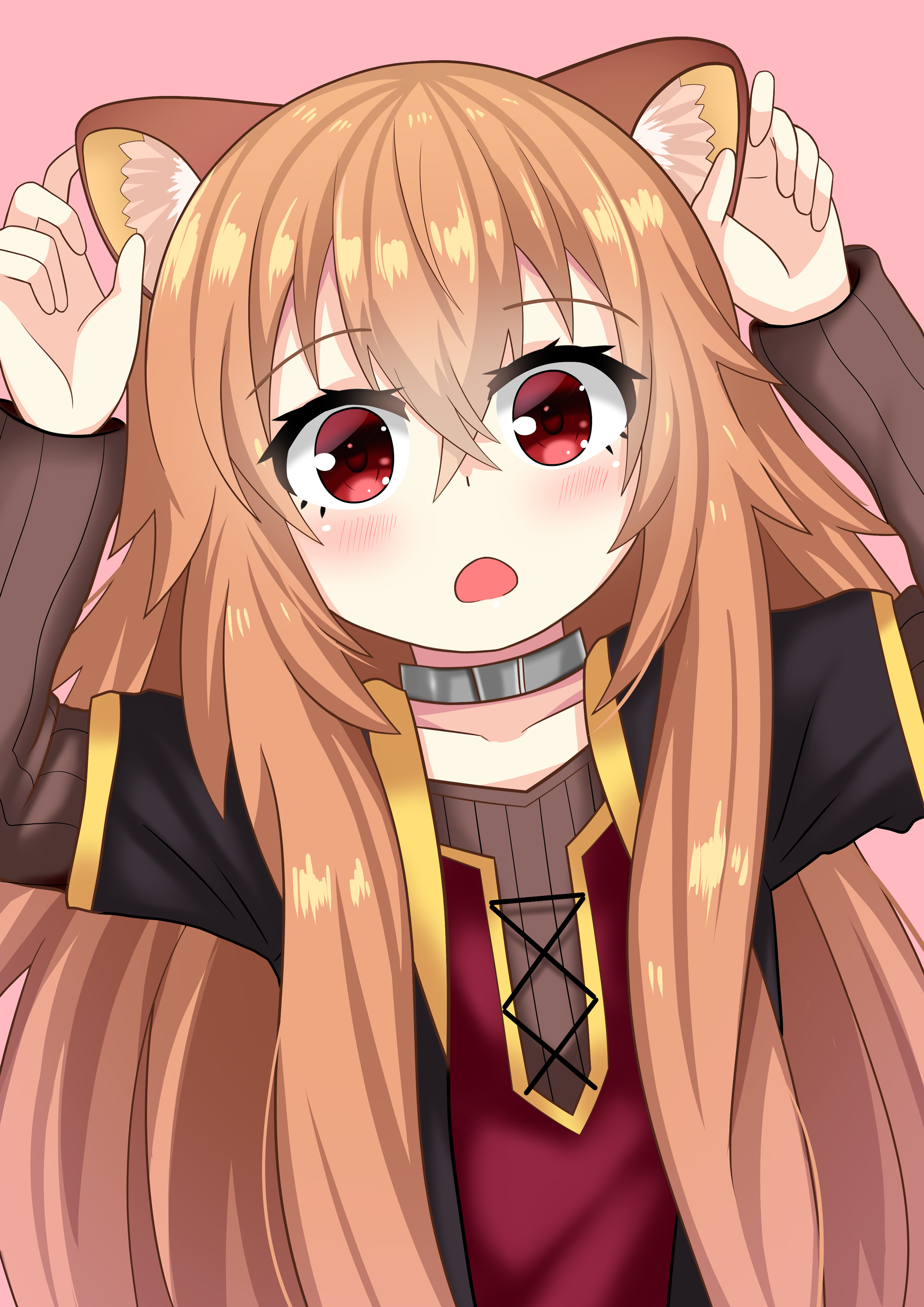1girl :o absurdres animal_ear_fluff animal_ears arms_up black_dress blush brown_dress brown_hair child collar collarbone commentary dress eyelashes gold_trim hair_between_eyes highres holding_own_ears long_hair long_sleeves looking_at_viewer messy_hair metal_collar open_mouth pink_background pinstripe_dress pinstripe_pattern raccoon_ears raccoon_girl raised_eyebrows raphtalia red_dress red_eyes short_sleeves solo straight-on tate_no_yuusha_no_nariagari the_only_shoe upper_body