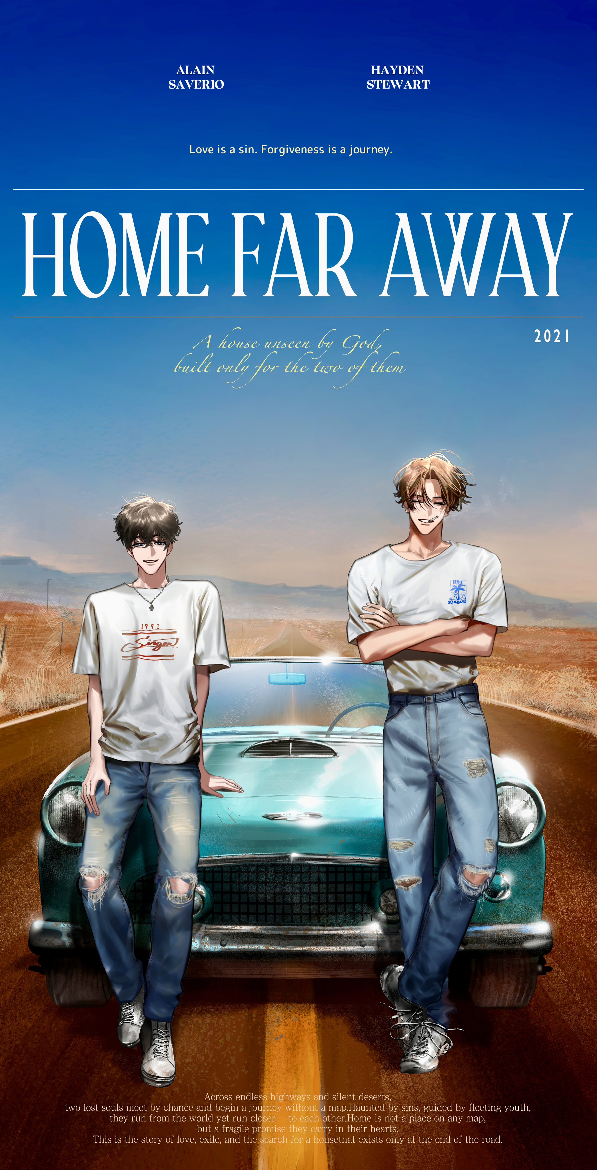 2boys absurdres alain_saverio black_hair brown_hair car copyright_request denim desert english_text haruka_tooki_ie hayden_stewart highres jeans jewelry motor_vehicle mukashi95 multiple_boys necklace pants road shirt smile smoking torn_clothes torn_jeans torn_pants white_shirt yaoi