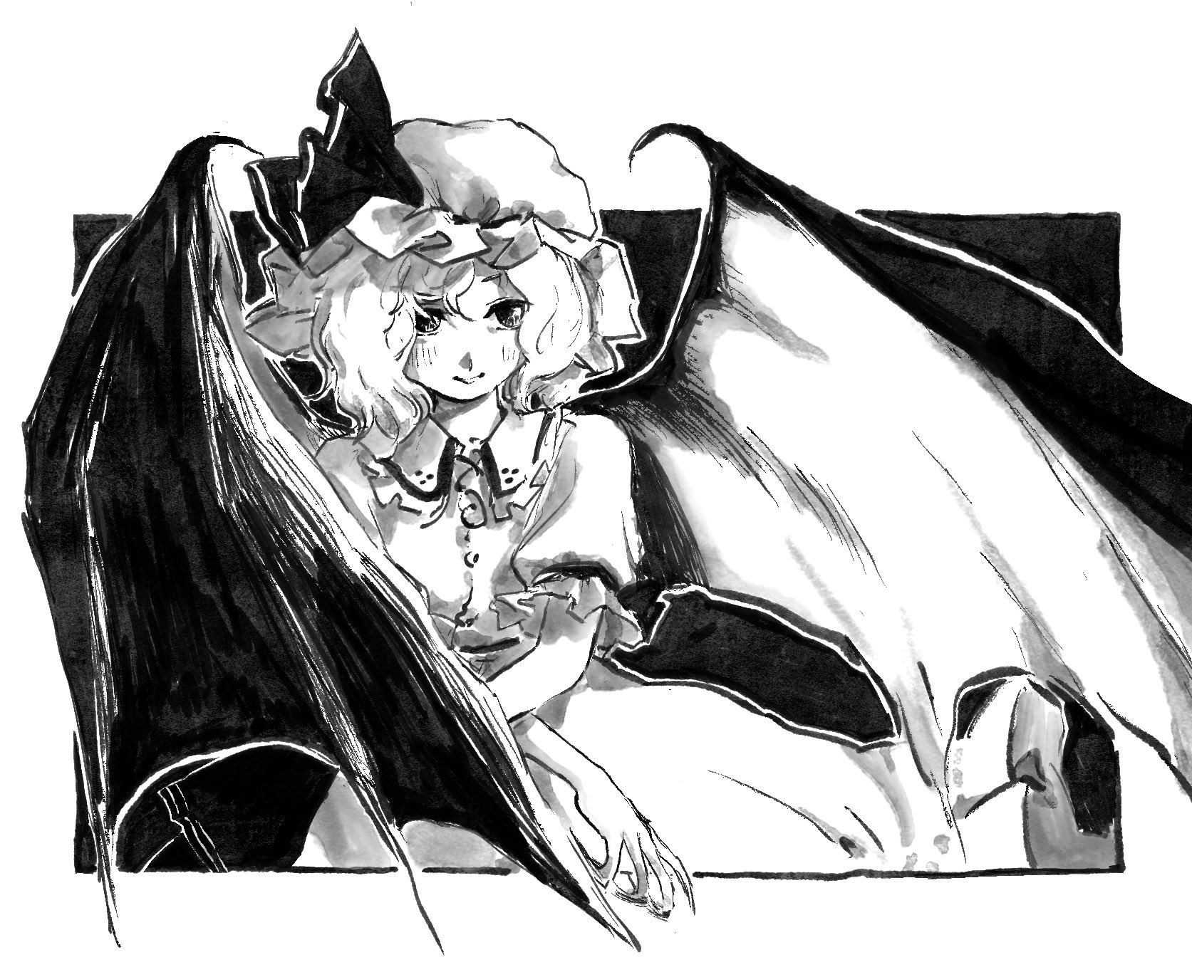 1girl bat_wings blush closed_mouth dress hat highres mob_cap monochrome parted_bangs ra9gaki_22ki remilia_scarlet short_sleeves smile solo touhou vampire wavy_hair white_dress wings