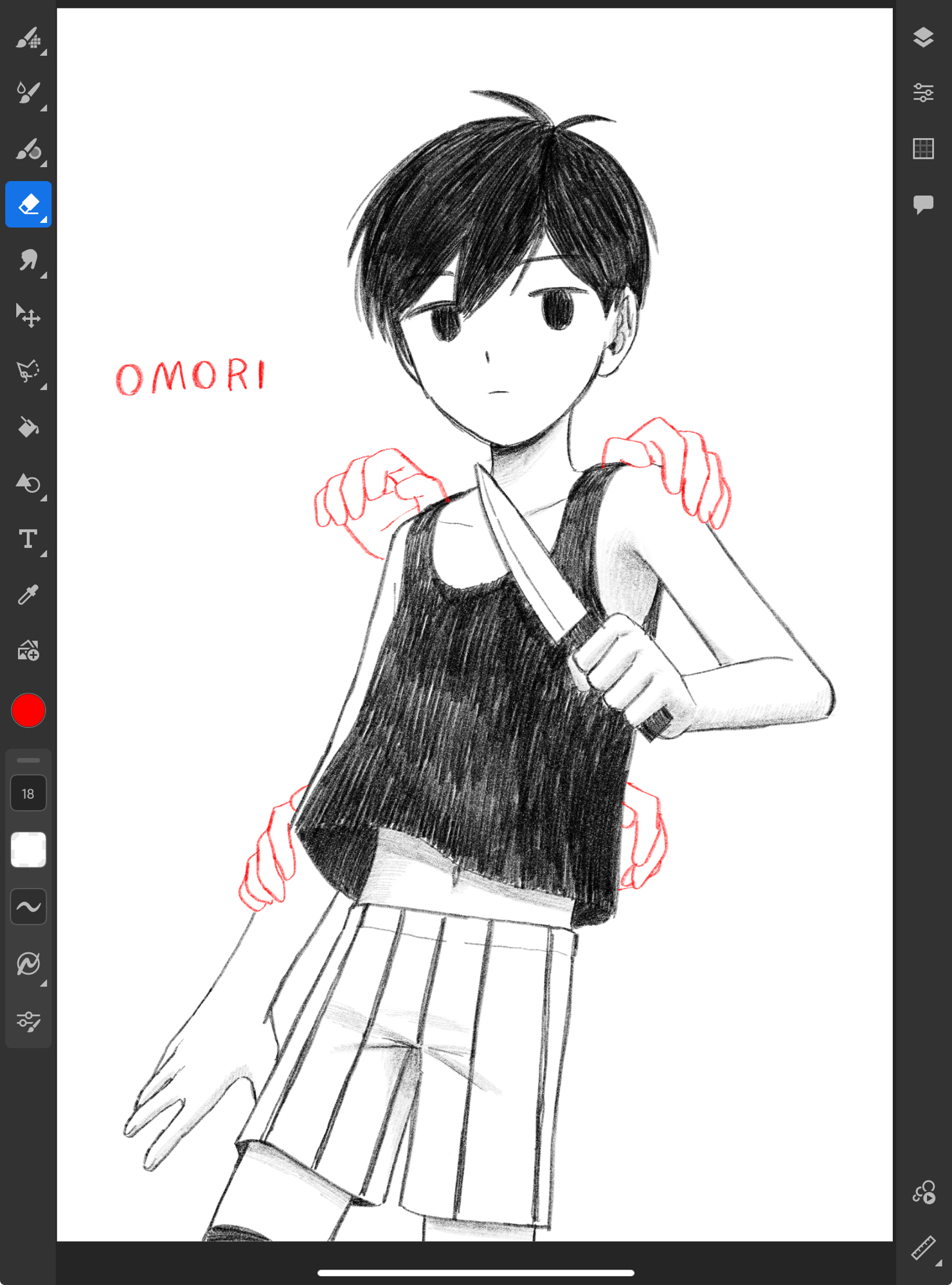 1boy antenna_hair art_program_in_frame bare_arms bare_shoulders closed_mouth collarbone copyright_name cowboy_shot double-parted_bangs empty_eyes expressionless extra_arms greyscale hair_behind_ear hair_between_eyes hatching_(texture) high_contrast highres holding holding_knife knife male_focus menma_(enaic31) monochrome navel no_pupils omori omori_(omori) pinstripe_shorts screencap short_hair shorts simple_background solo spot_color tank_top thighhighs very_short_hair white_background