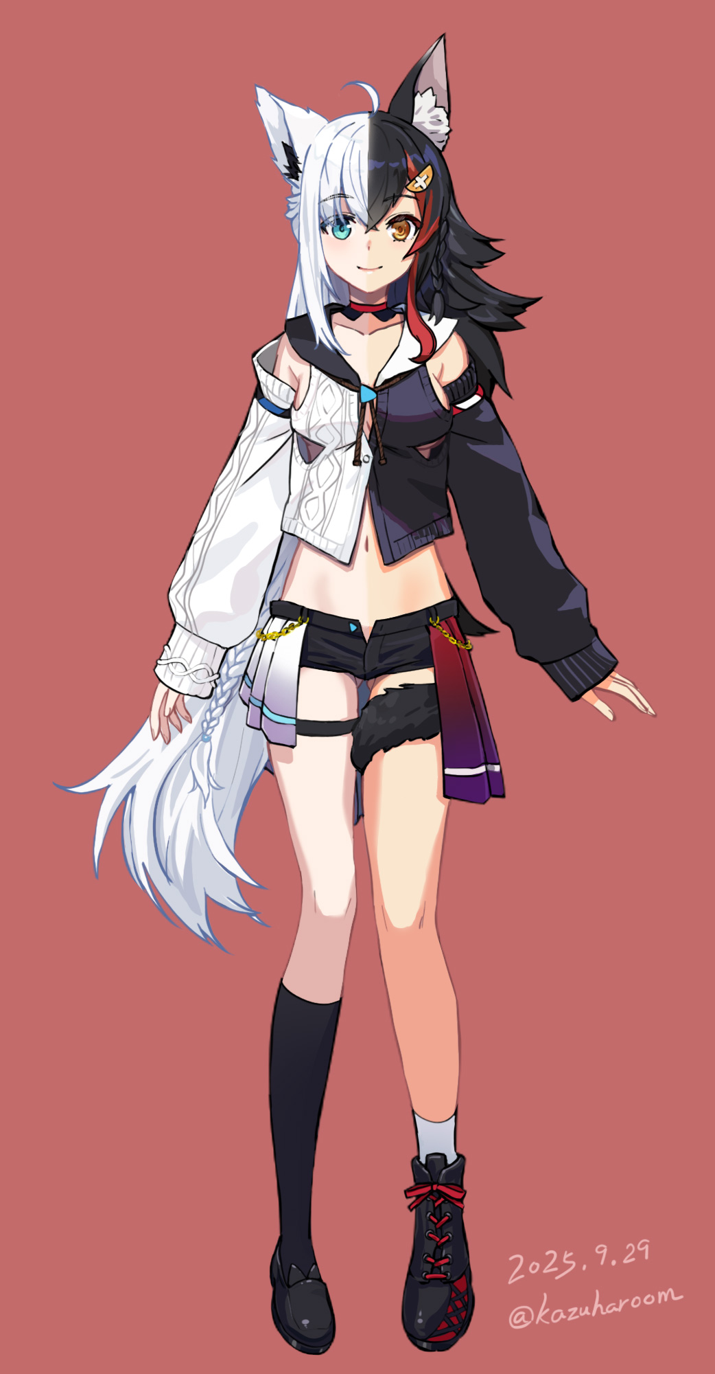 animal_ear_fluff animal_ears asymmetrical_legwear black_hair breasts choker cleavage collarbone hair_ornament hairpin haruyama_kazunori heterochromia highres multicolored_hair navel sideboob split-color_hair tail underboob white_hair