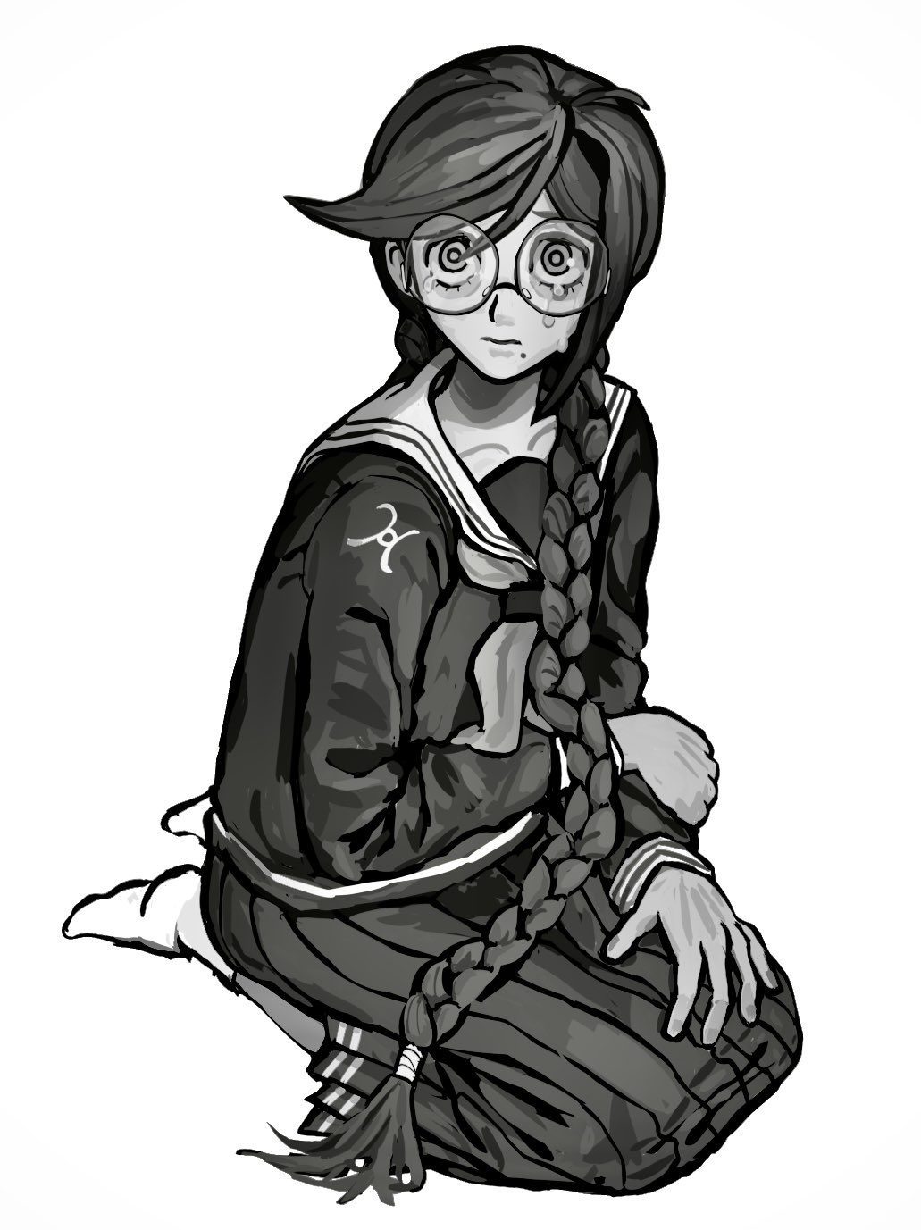 1girl booger13801449 braid closed_mouth collared_shirt crying crying_with_eyes_open danganronpa:_trigger_happy_havoc danganronpa_(series) eyelashes fukawa_toko full_body glasses greyscale highres kneeling long_hair long_sleeves mole mole_under_mouth monochrome neckerchief no_shoes round_eyewear sailor_collar school_uniform serafuku shirt simple_background skirt socks solo tears very_long_hair white_background