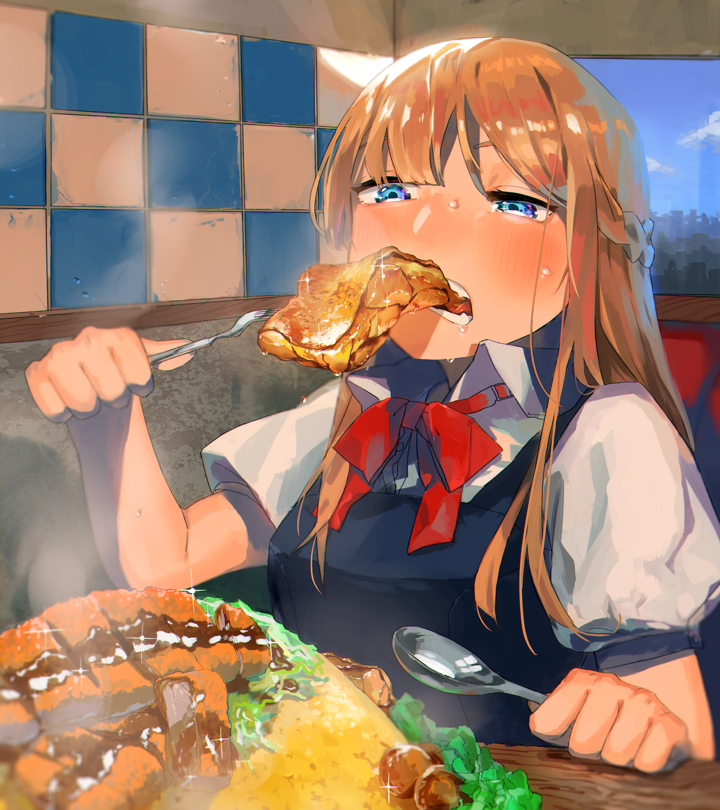 1girl agyou_sonokou_l black_dress blue_eyes blush booth_seating bow bowtie braid breasts brown_hair collared_shirt commentary_request dress eating fangs food food_in_mouth food_request fork half-closed_eyes half_up_braid hand_up highres holding holding_fork holding_spoon indoors katsu_(food) long_hair looking_at_food looking_down open_collar open_mouth original pinafore_dress puffy_short_sleeves puffy_sleeves red_bow red_bowtie school_uniform shirt short_sleeves sitting sleeveless sleeveless_dress small_breasts solo sparkle spoon steam sweat table tile_wall tiles upper_body white_shirt window