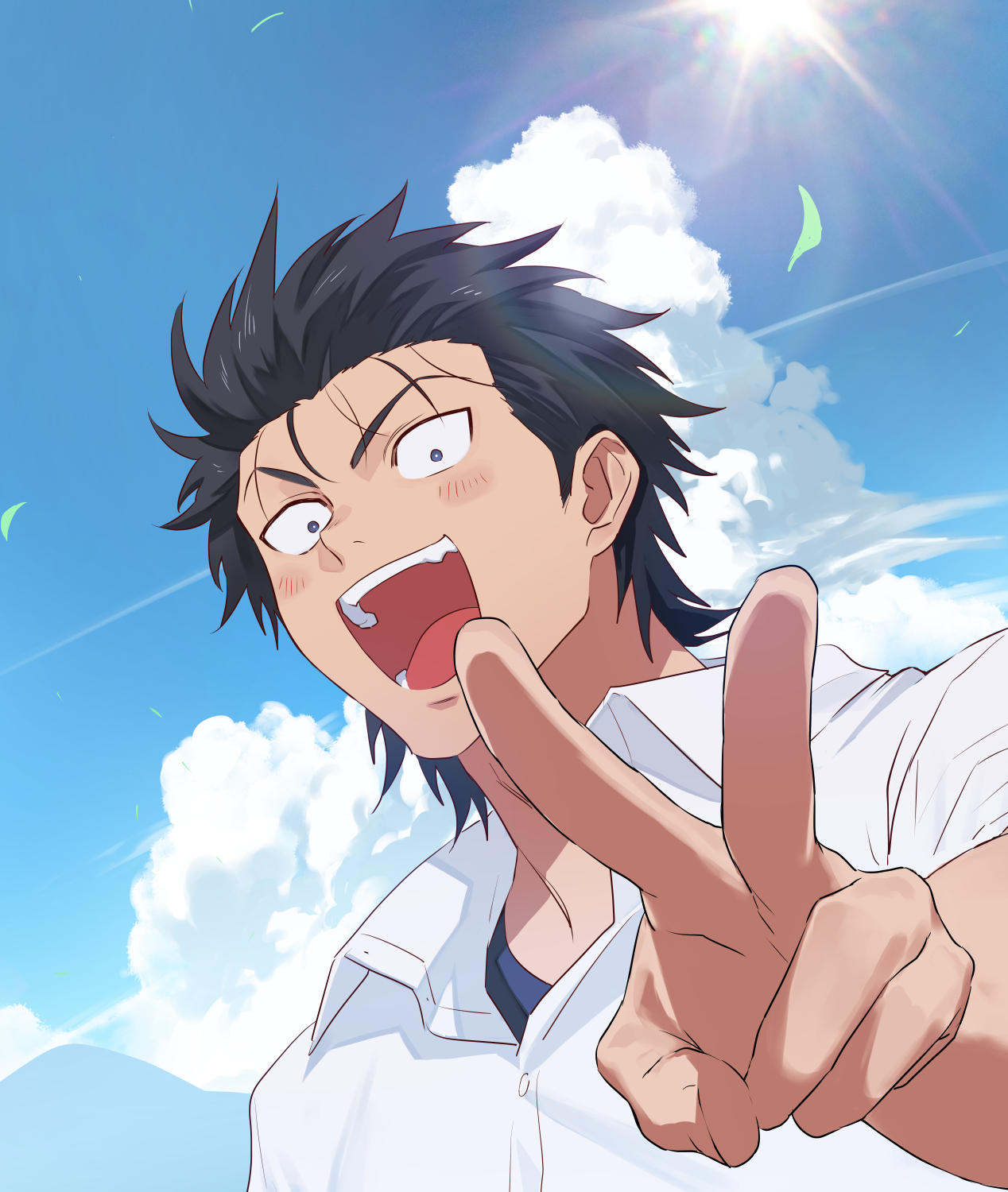 1boy black_hair blue_shirt blue_sky cloud collared_shirt commentary_request haiki_(tegusu) highres looking_at_viewer male_focus open_mouth original shirt short_hair sky smile solo sun sunlight teeth upper_body v white_shirt yamato_(haiki)