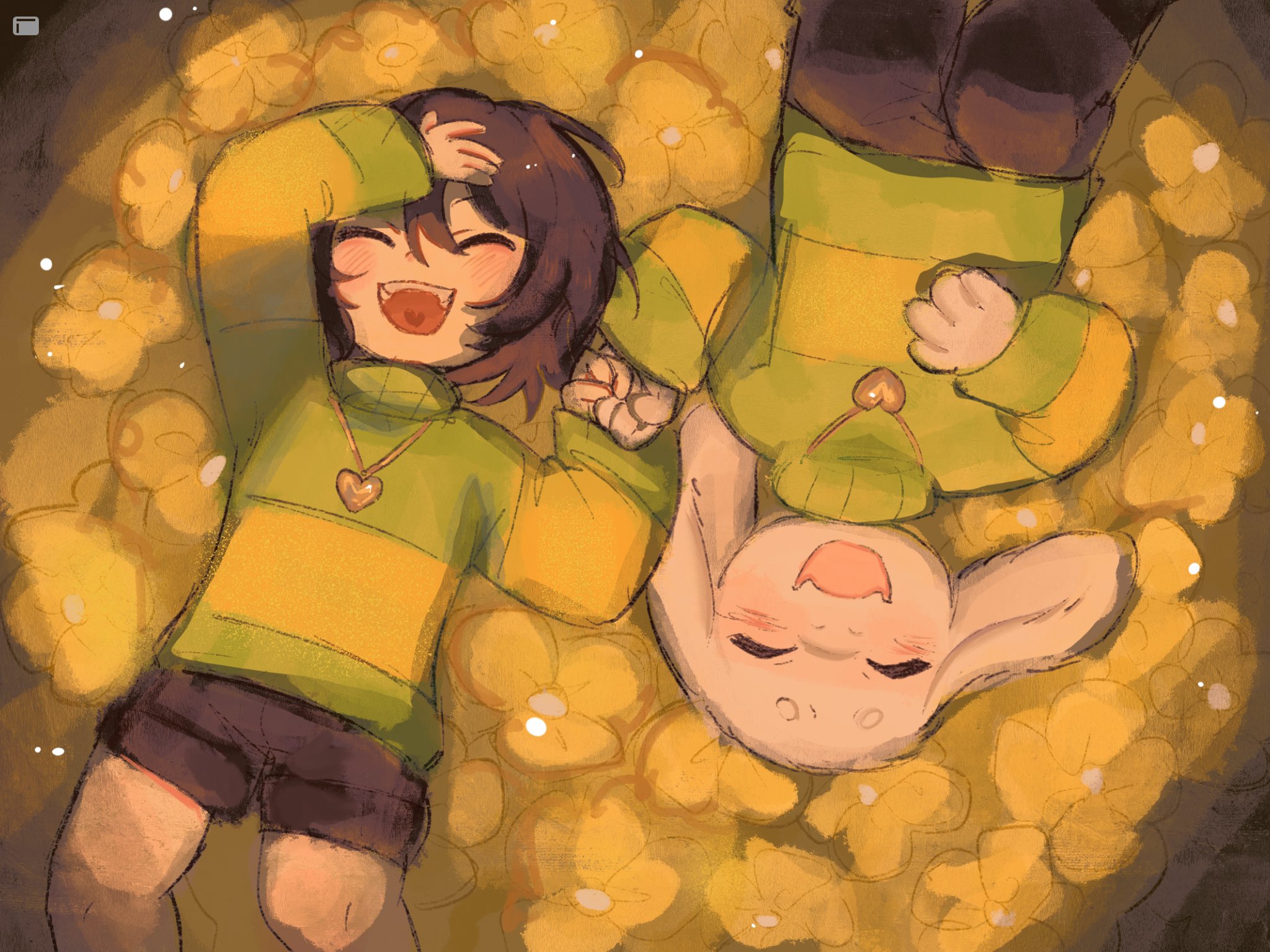 1boy 1other animal_ears asriel_dreemurr brown_hair brown_pants brown_shorts chara_(undertale) closed_eyes commentary flower furry furry_male goat_boy goat_ears green_sweater hashtag-only_commentary heart_locket highres holding_hands kannonkaza lying on_back on_ground pants rotational_symmetry short_hair shorts single_horizontal_stripe smile striped_clothes striped_sweater sweater undertale utdr_(toby_fox) yellow_flower