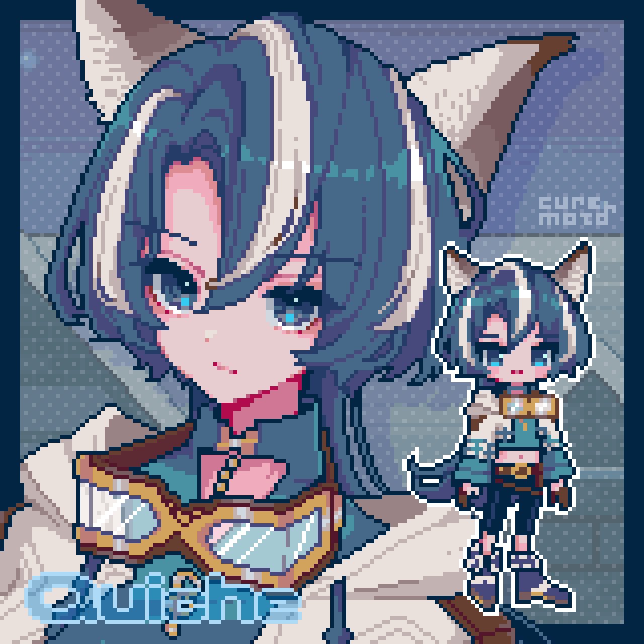 1girl animal_ears artist_name blue_border blue_eyes blue_hair border character_name expressionless goggles goggles_around_neck highres jacket kemono_teatime kyua_moto long_hair looking_at_viewer multicolored_hair multiple_views outside_border quiche_(kemono_teatime) streaked_hair upper_body white_jacket wolf_ears wolf_girl