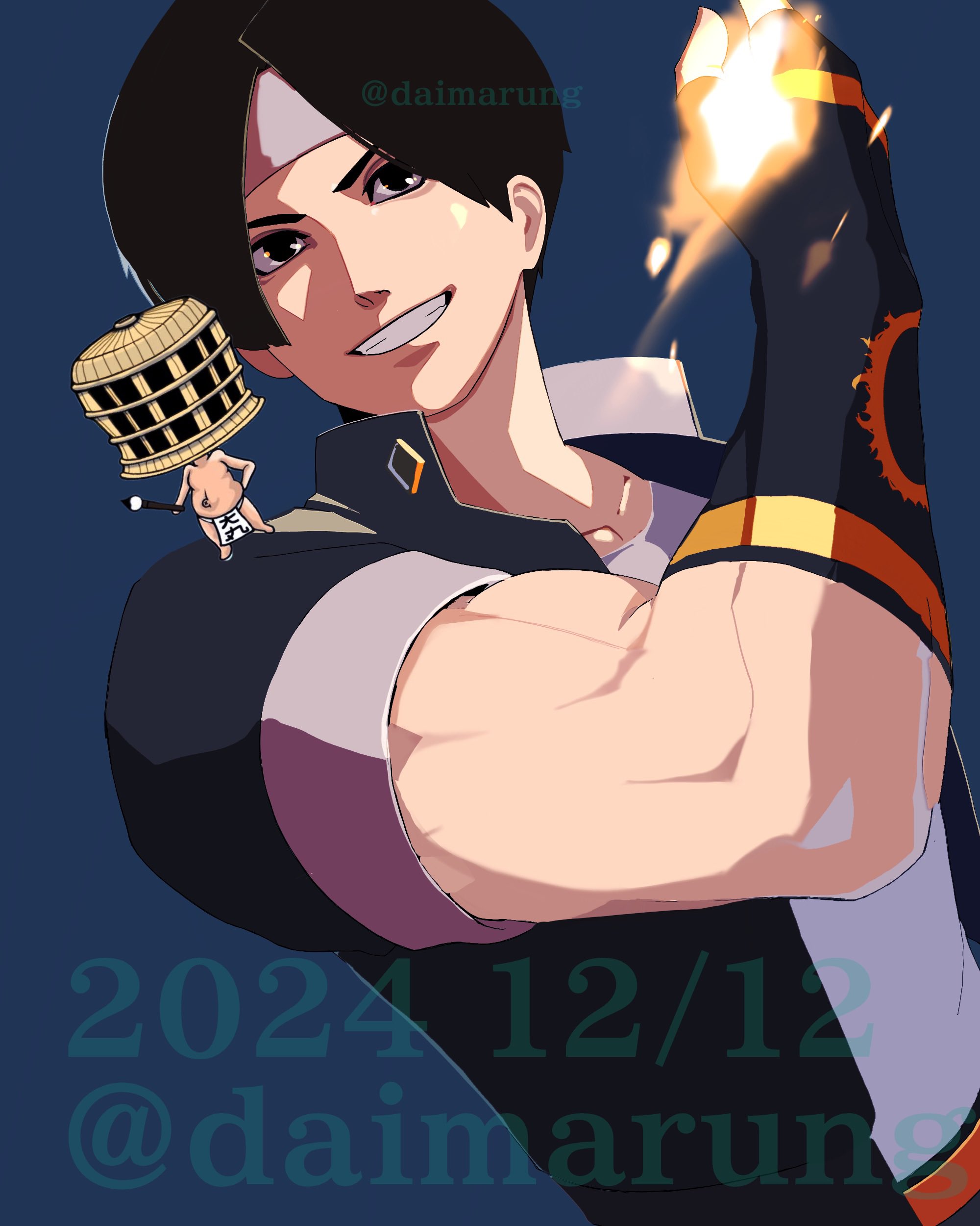 1boy absurdres black_hair black_jacket blue_background brown_eyes daimaru_(s29y2c) dated fingerless_gloves fire gakuran gloves grin headband highres jacket kusanagi_kyou looking_at_viewer male_focus pyrokinesis school_uniform shirt short_hair simple_background smile solo the_king_of_fighters twitter_username white_headband white_shirt