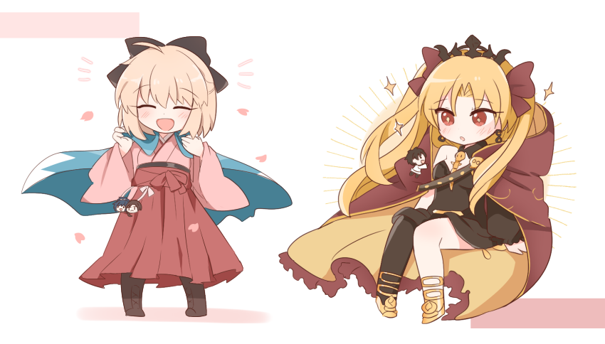 +_+ 2girls ahoge belt black_bow black_dress black_thighhighs black_tiara blonde_hair blue_haori blush boots bow brown_boots chibi chibi_only cloak closed_eyes dress earrings ereshkigal_(fate) eyelashes fate/grand_order fate_(series) floating_clothes fujimaru_ritsuka_(male) full_body gold_sandals hair_bow hakama hakama_skirt hands_up haori japanese_clothes jewelry kimono long_hair long_sleeves looking_at_another multiple_girls notice_lines okita_souji_(fate) okita_souji_(first_ascension)_(fate) okita_souji_(koha-ace) open_clothes open_mouth parted_bangs petals pink_kimono rabi_(swordofthestone) red_bow red_cloak red_eyes red_ribbon red_skirt ribbon sandals shadow short_hair simple_background single_bare_shoulder single_thighhigh sitting skirt smile sparkle standing thighhighs tiara two-sided_cloak two-sided_fabric two_side_up white_background wide_sleeves yamanami_keisuke_(fate) yellow_belt yellow_cloak