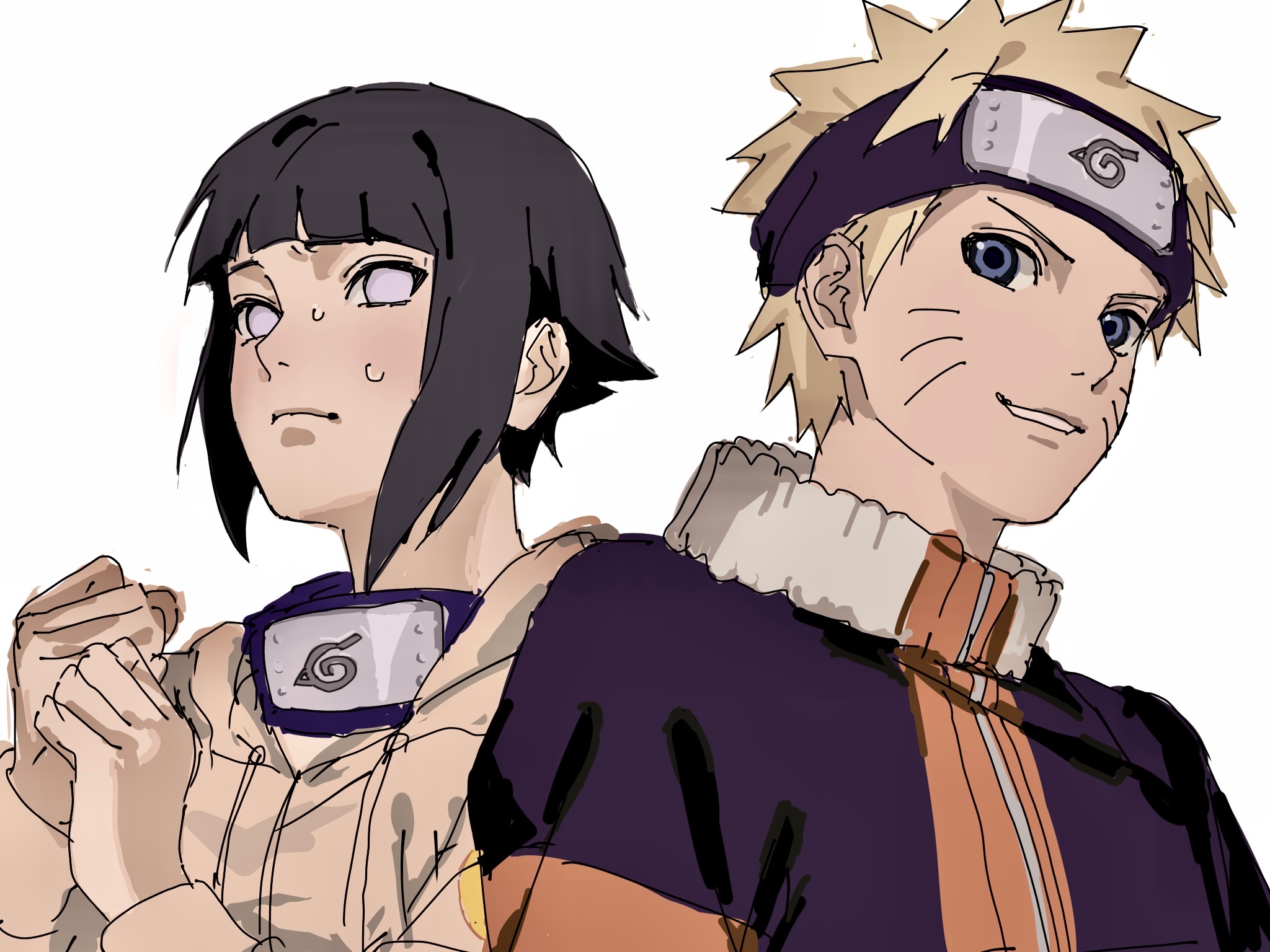 1boy 1girl black_hair blonde_hair blue_eyes blunt_bangs en7yrp2 facial_mark furrowed_brow grey_hoodie headband highres hood hood_down hoodie hyuuga_hinata jumpsuit naruto_(classic) naruto_(series) nervous_sweating no_pupils own_hands_together parted_lips short_hair sidelocks smile spiked_hair sweat upper_body uzumaki_naruto whisker_markings white_background white_eyes
