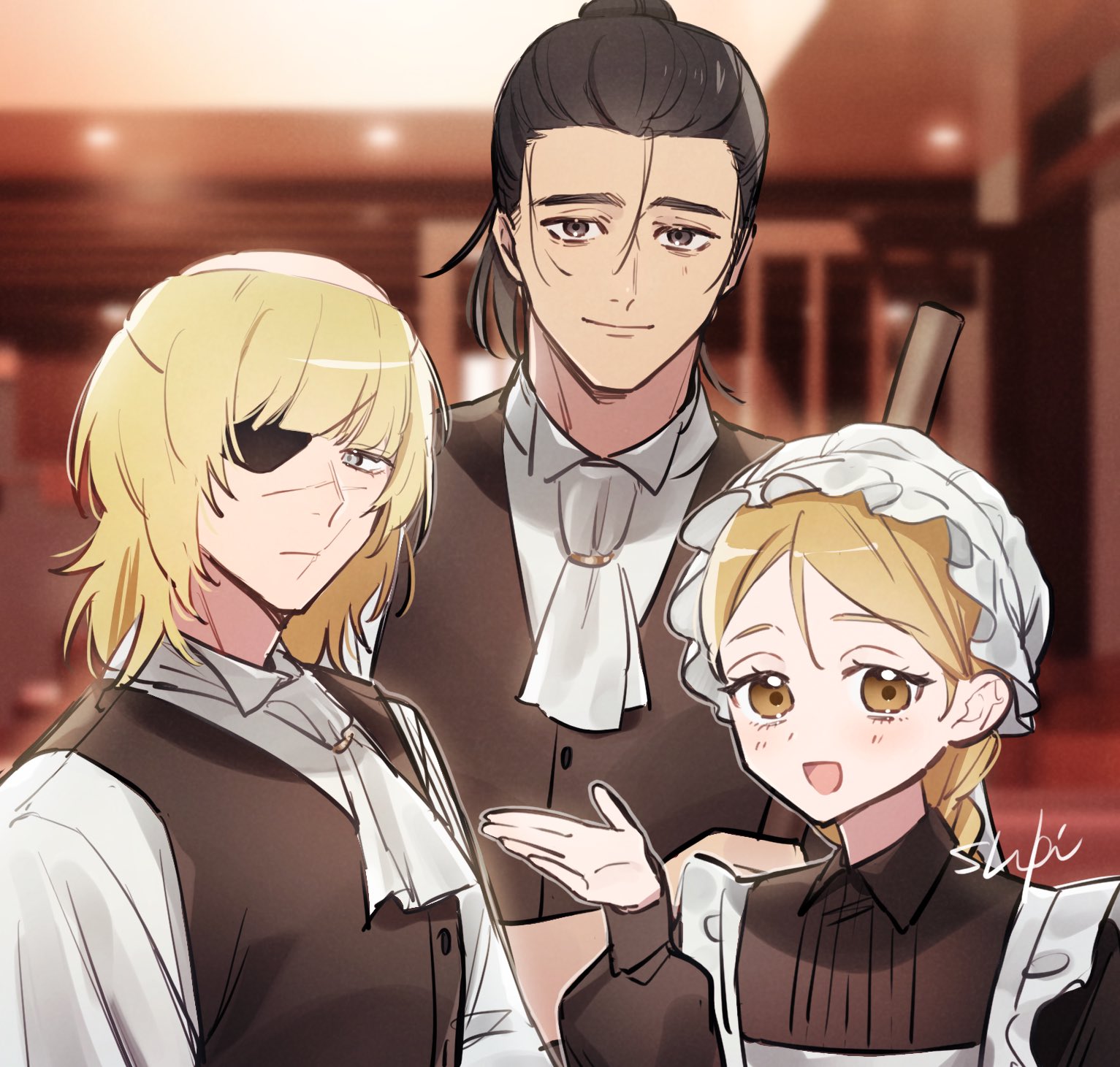 1girl 2boys apron ascot badeni black_dress black_hair black_vest blonde_hair blunt_bangs blurry blurry_background bonnet braid brown_eyes chi.:_chikyuu_no_undou_ni_tsuite collared_dress collared_shirt dress eyepatch frilled_apron frills grey_hair hair_between_eyes hair_bun hakujitsu_chi hand_up highres holding holding_mop jolenta light_blush light_smile maid_apron medium_hair mop multiple_boys oczy official_alternate_costume open_mouth ponytail scar scar_on_face scar_on_mouth scar_on_nose shirt single_braid smile tonsure vest white_apron white_ascot white_bonnet white_shirt