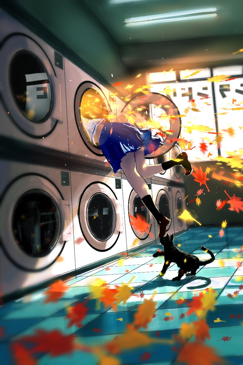1girl animal autumn_leaves black_cat black_socks blue_skirt blurry cat highres indoors leaf maple_leaf original pleated_skirt sanmen_(threeface_il) school_uniform shirt shoes skirt socks solo tile_floor tiles washing_machine white_shirt