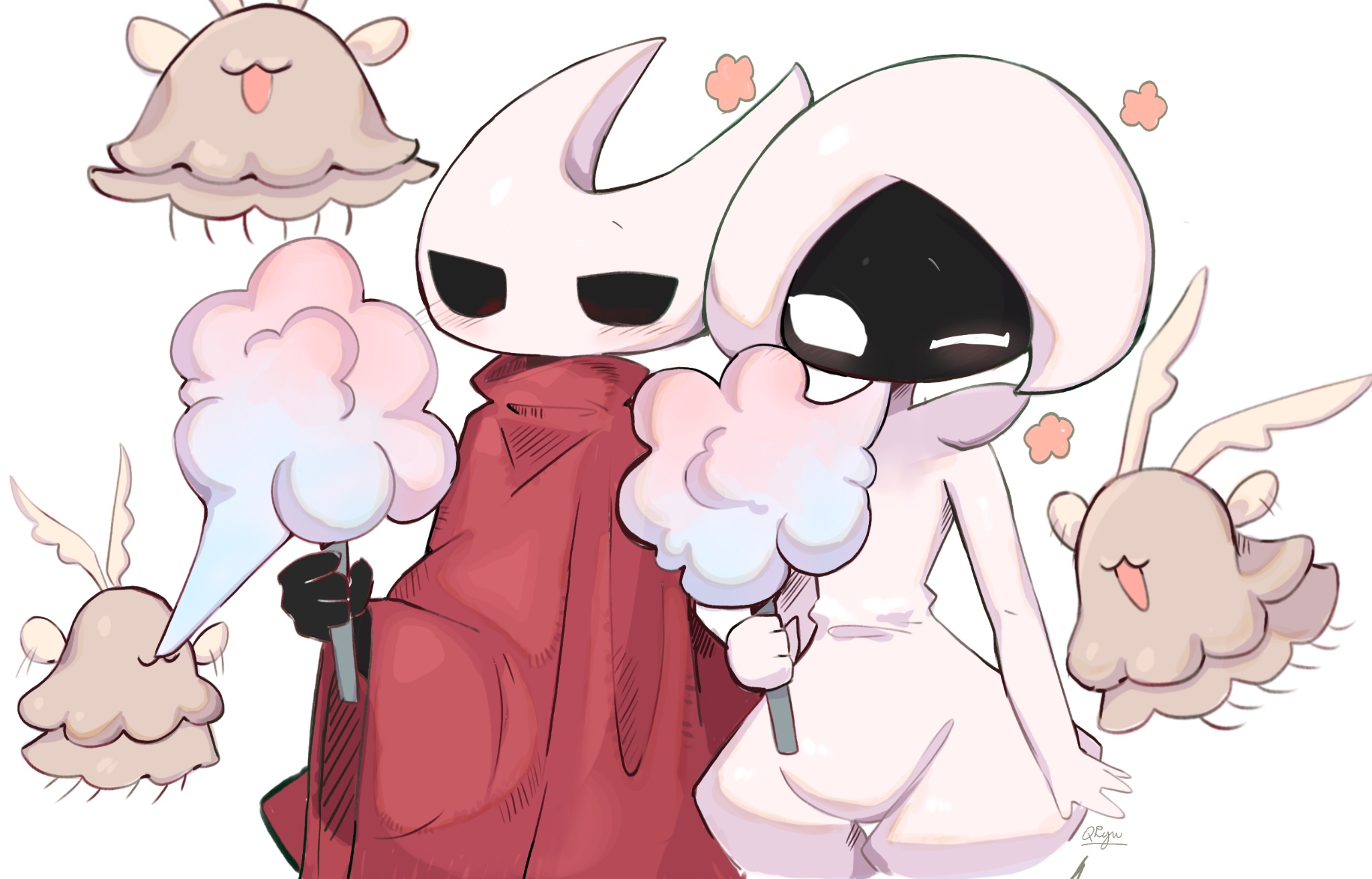 17hornet77987 2girls :3 arm_at_side arthropod_girl artist_name black_eyes black_skin blank_eyes blush closed_mouth colored_skin cotton_candy cowboy_shot eating female_focus flea_(hollow_knight) food furry furry_female half-closed_eyes hand_up happy happy_aura highres holding holding_food hollow_knight hollow_knight:_silksong hornet_(hollow_knight) lace_(hollow_knight) multiple_girls one_eye_closed open_mouth signature simple_background smile standing white_background white_eyes