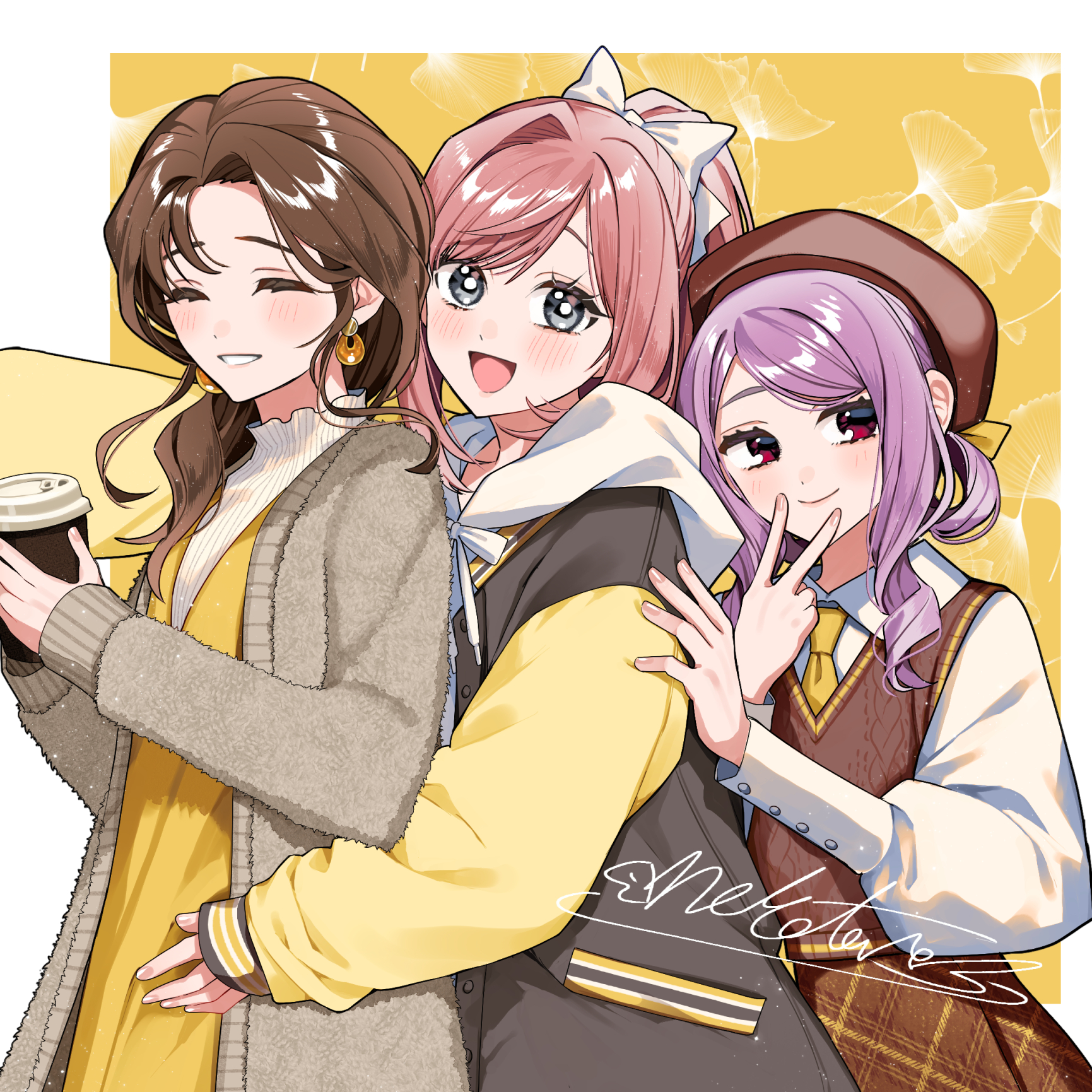 3girls :d alexandra_cecily alternate_costume blush brown_hair closed_eyes commentary_request diana_(akutsuka) earrings genkai_ol-san_wa_akuyaku_reijou-sama_ni_tsukaetai hair_ornament highres holding jewelry long_hair long_sleeves looking_at_viewer multiple_girls natori_midori open_mouth pink_hair purple_hair red_eyes shinonome_neko-tarou signature smile v yuri