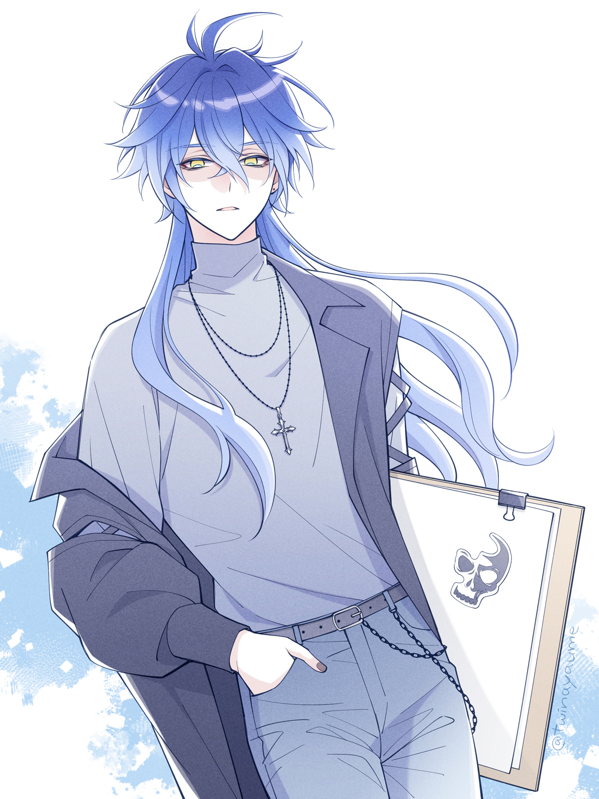 1boy antenna_hair belt black_belt black_jacket blue_hair blue_pants casual commentary crossed_bangs denim double-parted_bangs easel empty_eyes english_commentary flins_(genshin_impact) floating_hair genshin_impact grey_shirt hair_between_eyes hand_in_pocket highres holding jacket jeans long_hair long_sleeves looking_to_the_side male_focus nail_polish open_clothes open_jacket pants parted_lips shirt shirt_tucked_in solo turtleneck twinayaume very_long_hair white_background yellow_eyes