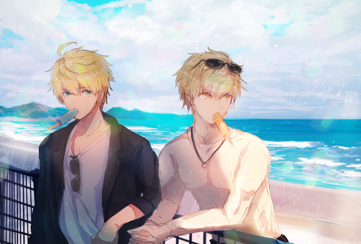 2boys ahoge arthur_pendragon_(fate) arthur_pendragon_alter_(fate) beach black-framed_eyewear black_jacket blonde_hair blue_eyes blue_sky cloud cloudy_sky day dual_persona ebi_(6_5) eyewear_on_head fate/grand_order fate_(series) fence food food_in_mouth hair_between_eyes jacket jewelry lapels long_sleeves looking_at_viewer looking_up male_focus mountain multiple_boys muscular muscular_male necklace ocean open_clothes open_jacket outdoors own_hands_together pectorals popsicle popsicle_in_mouth sand shirt short_hair sky summer sunglasses sunlight t-shirt unworn_eyewear wet white_shirt yellow_eyes
