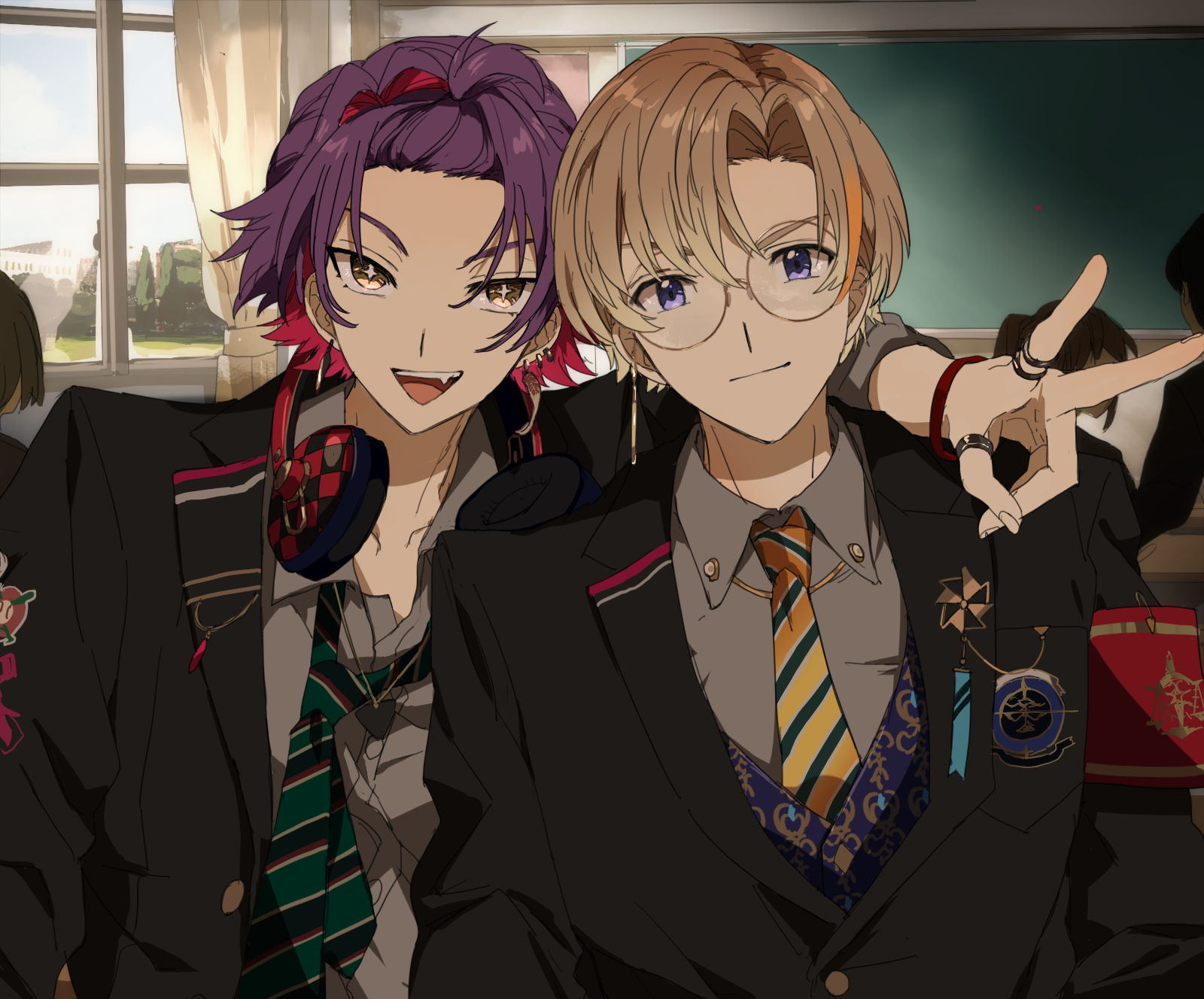 2boys arm_around_shoulder bangs_pinned_back black_jacket bracelet brown_hair classroom colored_inner_hair curtained_hair fura_kanato fura_kanato_(school_uniform) glasses grey_shirt hair_intakes hashtag-only_commentary headphones headphones_around_neck highres indoors jacket jewelry looking_at_viewer male_focus matsuhago multicolored_hair multiple_boys necklace nijisanji official_alternate_costume purple_eyes purple_hair school_uniform shirt short_hair smile two-tone_hair v virtual_youtuber watarai_hibari watarai_hibari_(school_uniform) yellow_eyes