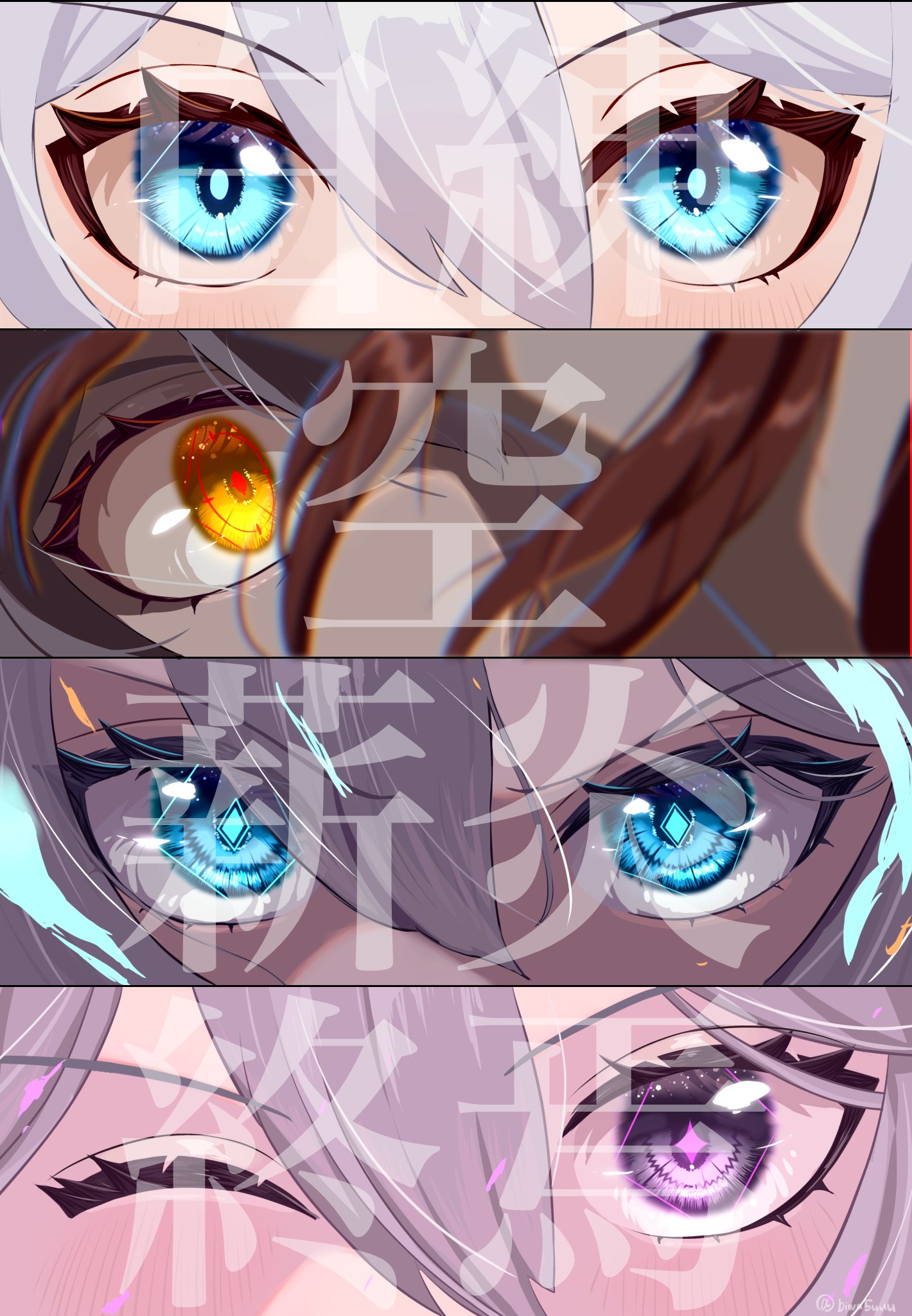 1girl biwa5uuu blue_eyes blush_stickers close-up diamond-shaped_pupils diamond_(shape) hair_between_eyes highres honkai_(series) honkai_impact_3rd kiana_kaslana kiana_kaslana_(herrscher_of_finality) kiana_kaslana_(herrscher_of_flamescion) kiana_kaslana_(herrscher_of_the_void) kiana_kaslana_(white_comet) murata_himeko murata_himeko_(vermillion_knight) one_eye_closed purple_eyes red_hair red_pupils romaji_text star-shaped_pupils star_(symbol) symbol-shaped_pupils v-shaped_eyebrows white_hair yellow_eyes
