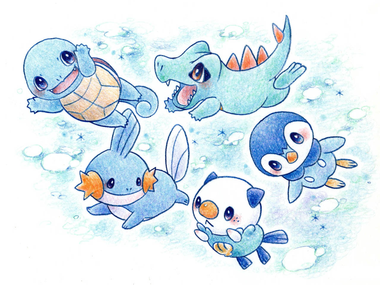 black_eyes blue_eyes blue_theme blush brown_eyes gen_1_pokemon gen_2_pokemon gen_3_pokemon gen_4_pokemon gen_5_pokemon mudkip nintendo no_humans open_mouth oshawott piplup pokemon pokemon_(creature) polkadot_(mocopeng) smile squirtle totodile