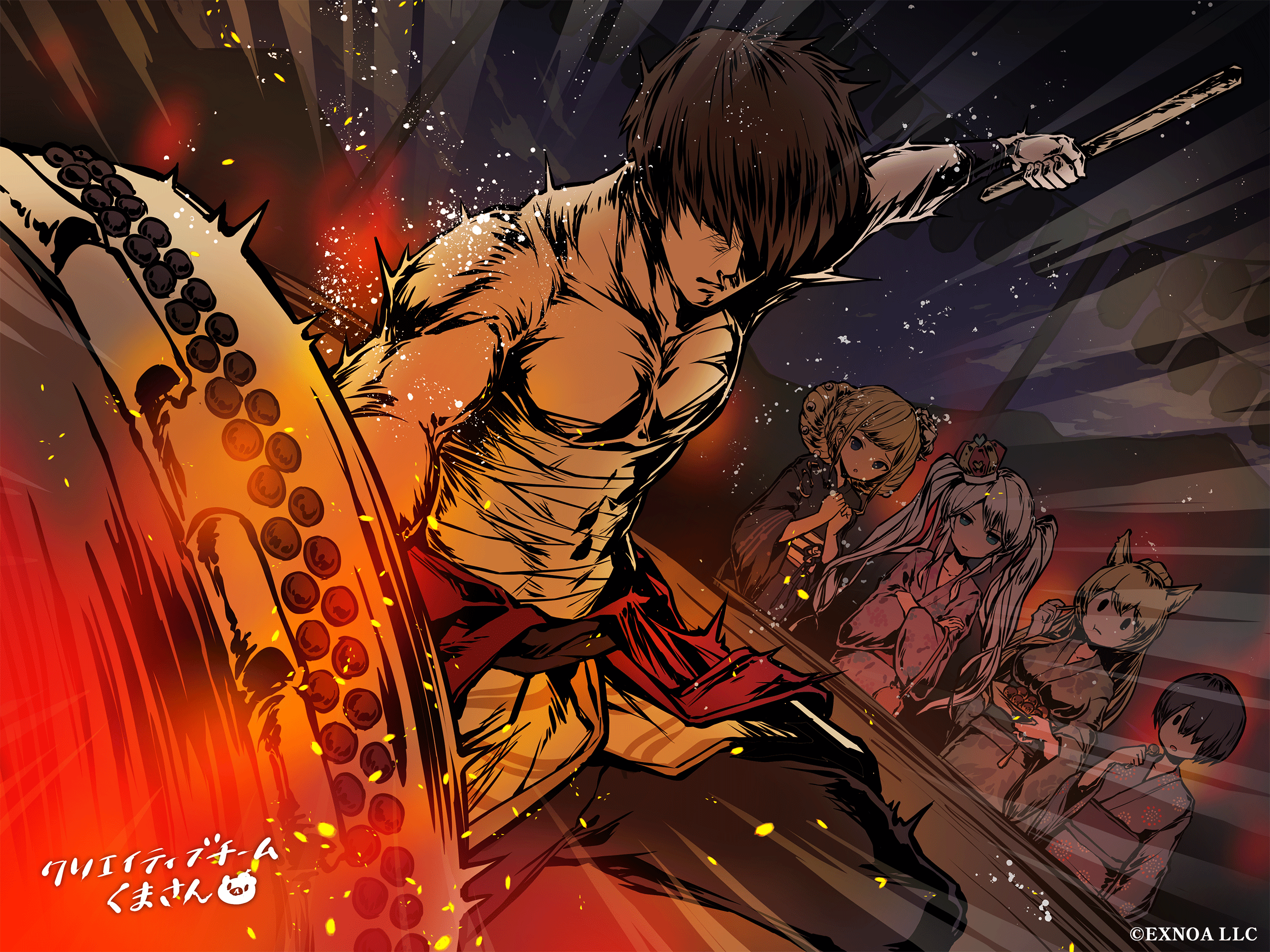 2boys 3girls black_hair blonde_hair blue_eyes brown_hair candy closed_mouth crossed_arms dmm eating festival food hair_over_eyes hair_over_one_eye highres holding holding_candy holding_food holding_stick japanese_clothes kimono master_(monmusu_td) monster_musume_td multiple_boys multiple_girls obi official_art open_mouth prince_(sennen_sensou_aigis) sash sennen_sensou_aigis stick takoyaki twintails yukata