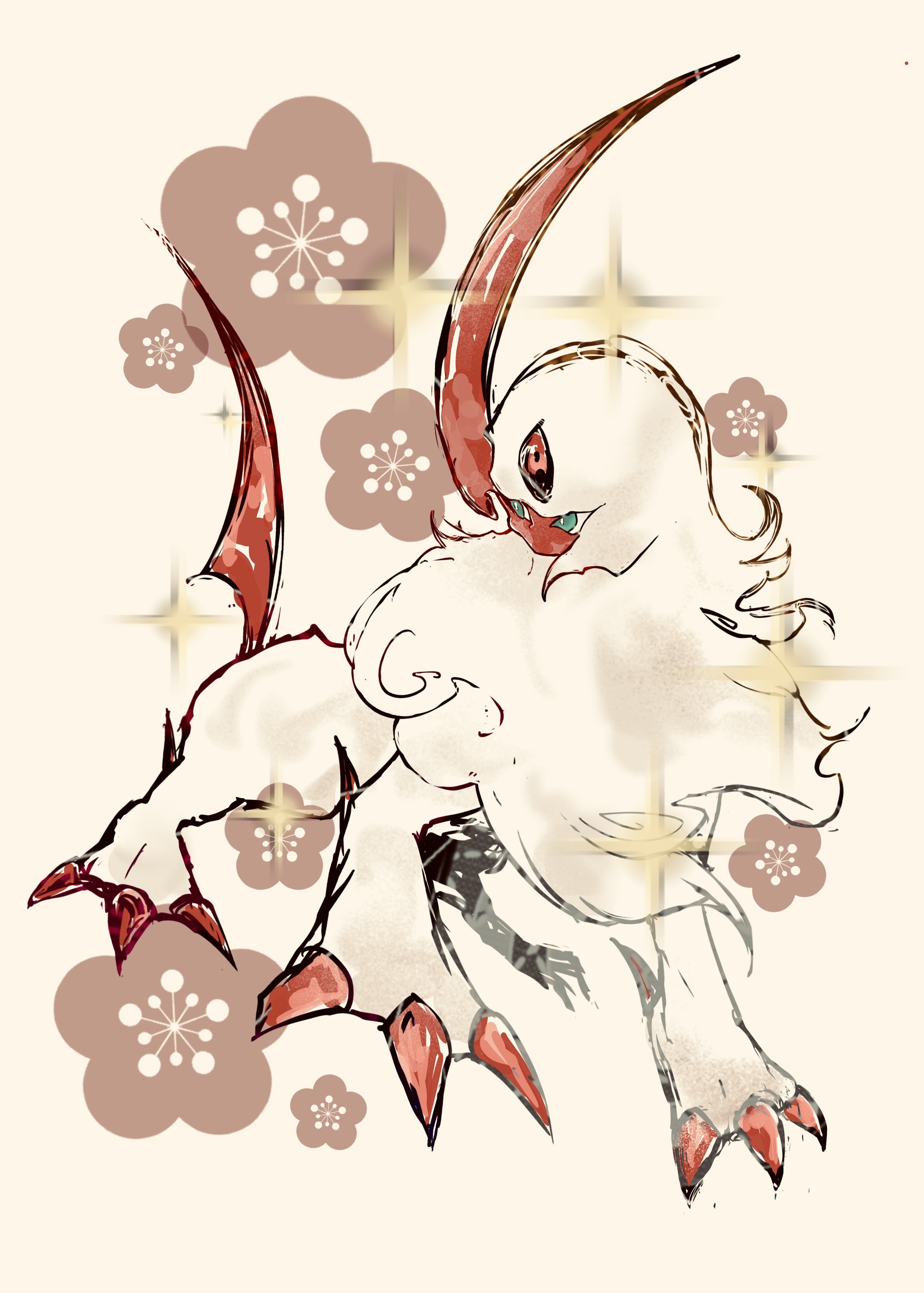 absol absurdres alternate_color animal_focus bright_pupils bwmtk1110 claws floral_background fluffy full_body gen_3_pokemon green_eyes highres horns looking_at_viewer mane mega_pokemon neck_fur nintendo no_humans pokemon pokemon_(creature) pokemon_focus shiny_pokemon simple_background single_horn solo sparkle standing white_background white_fur white_pupils