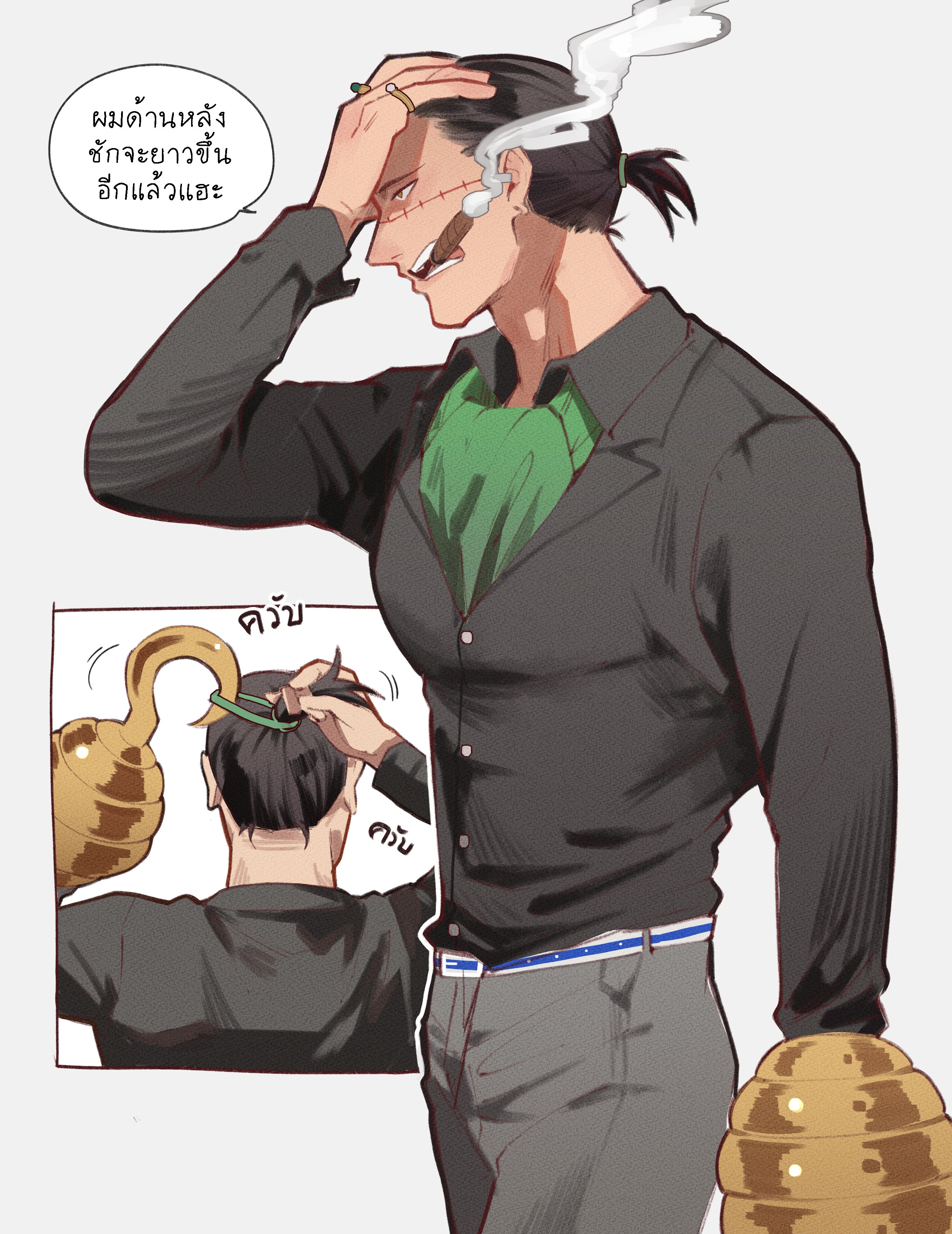 1boy absurdres ascot black_hair black_jacket cigar crocodile_(one_piece) green_ascot grey_pants hand_on_own_head highres hook_hand jacket long_sleeves male_focus mature_male mouth_hold multiple_views ngumngim one_piece pants ponytail short_ponytail simple_background speech_bubble stitched_face stitches teeth_hold thai_text translation_request tying_hair