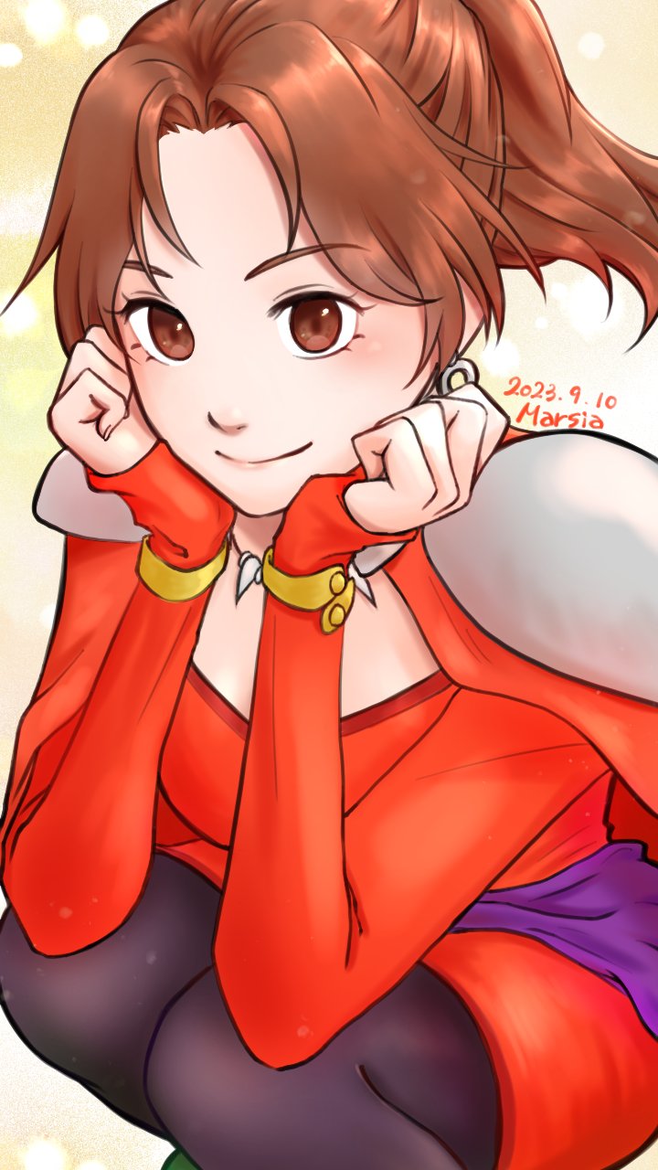 1girl arc_the_lad arc_the_lad_iii black_pantyhose brown_eyes brown_hair closed_mouth dated dress earrings highres jewelry long_hair looking_at_viewer marsia_(arc_the_lad) norao pantyhose ponytail red_dress skirt smile solo