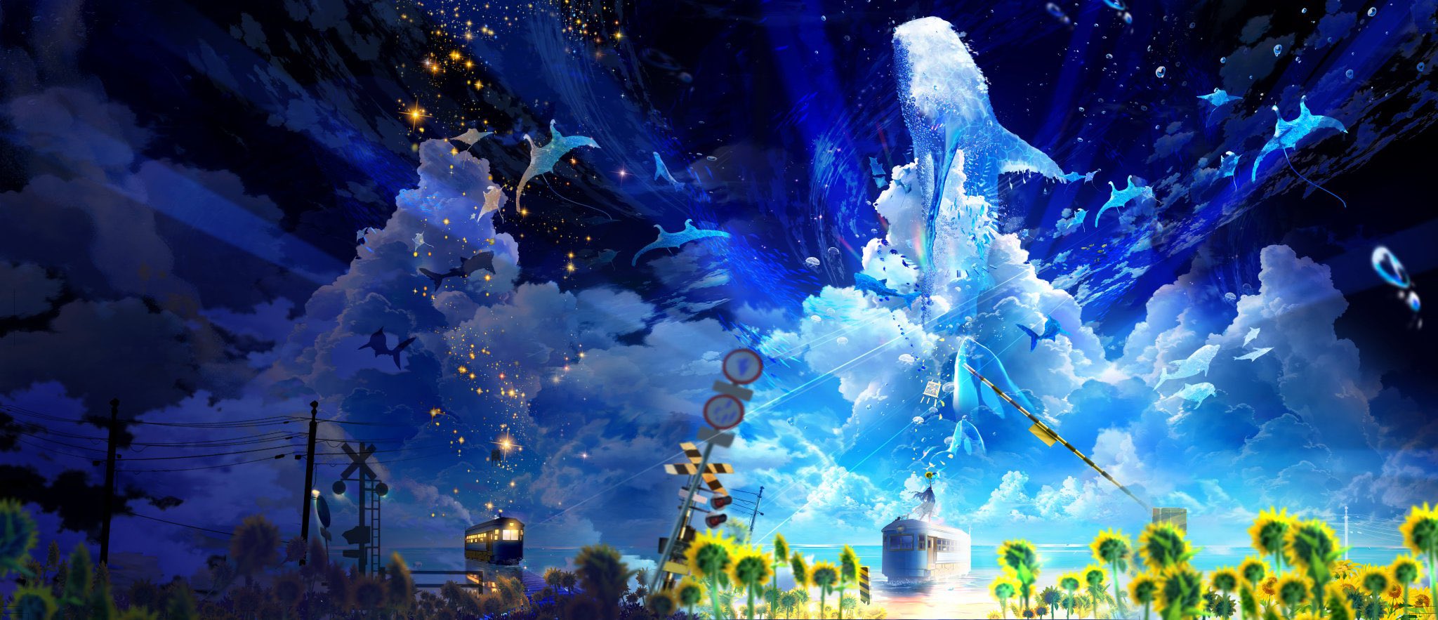 1girl blurry bubble cloud cumulonimbus_cloud dolphin field fish flower flower_field flying_fish hat highres horizon makoron117117 night ocean original outdoors railroad_crossing railroad_tracks road_sign scenery sign sky solo star_(sky) star_(symbol) starry_sky summer sunflower sunflower_field surreal train train_station water whale wide_shot yellow_flower