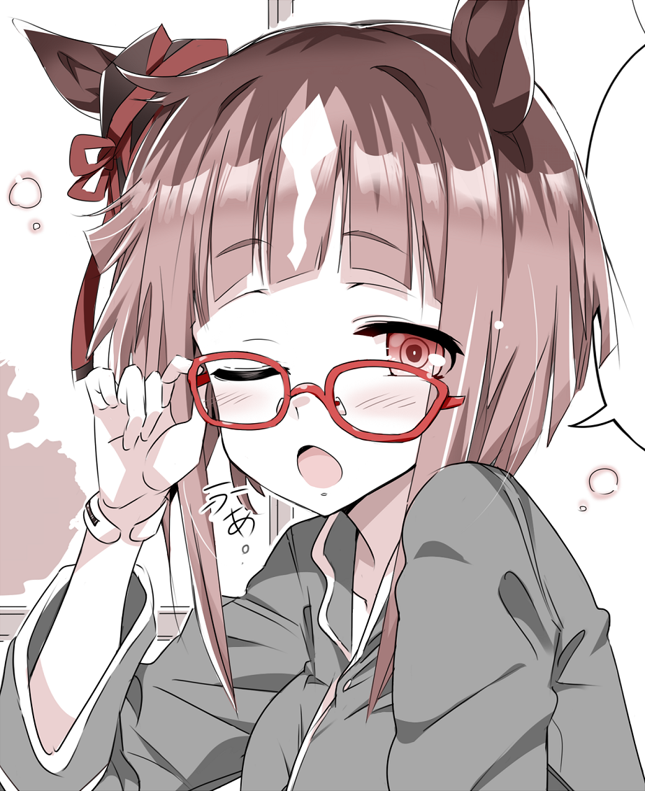 1girl ;o adjusting_eyewear animal_ears blush bow breasts brown_hair commentary_request ear_ribbon glasses grey_shirt horse_ears horse_girl kugimiya_atsuki large_breasts looking_at_viewer medium_hair one_eye_closed open_mouth portrait red-framed_eyewear red_eyes red_ribbon ribbon shirt solo transcend_(umamusume) translation_request umamusume waking_up yawning